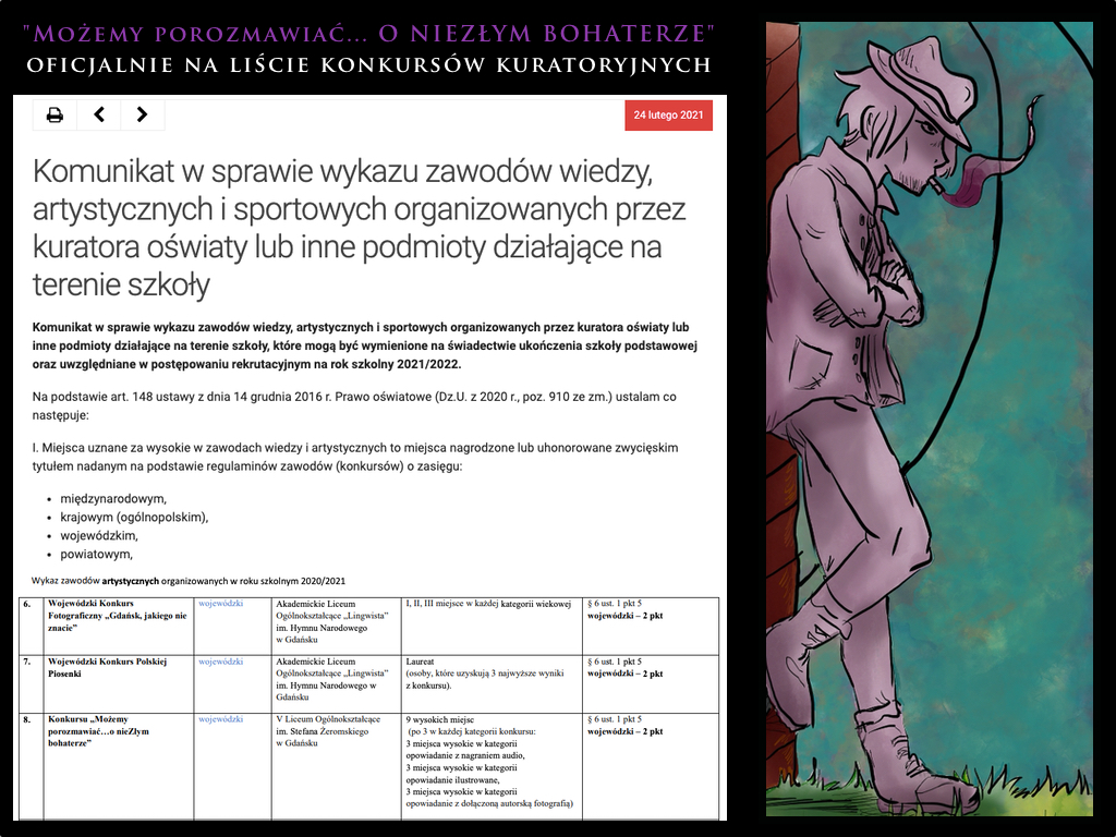 Z wielką przyjemnością przekazujemy wszystkim zainteresowanym informację, że konkurs “Możemy porozmawiać… o nieZłym bohaterze” organizowany przez V Liceum Ogólnokształcące im. Stefana Żeromskiego w Gdańsku uzyskał akceptację kuratora oświaty i znalazł się w wykazie zawodów wiedzy, artystycznych i sportowych organizowanych przez kuratora oświaty lub inne podmioty działające na terenie szkoły, które mogą być wymienione na świadectwie ukończenia szkoły podstawowej oraz uwzględniane w postępowaniu rekrutacyjnym na rok szkolny 2021/2022 ustalony na podstawie art. 148 ustawy z dnia 14 grudnia 2016 r. Prawo oświatowe (Dz.U. z 2020 r. poz. 910 ze zm.)