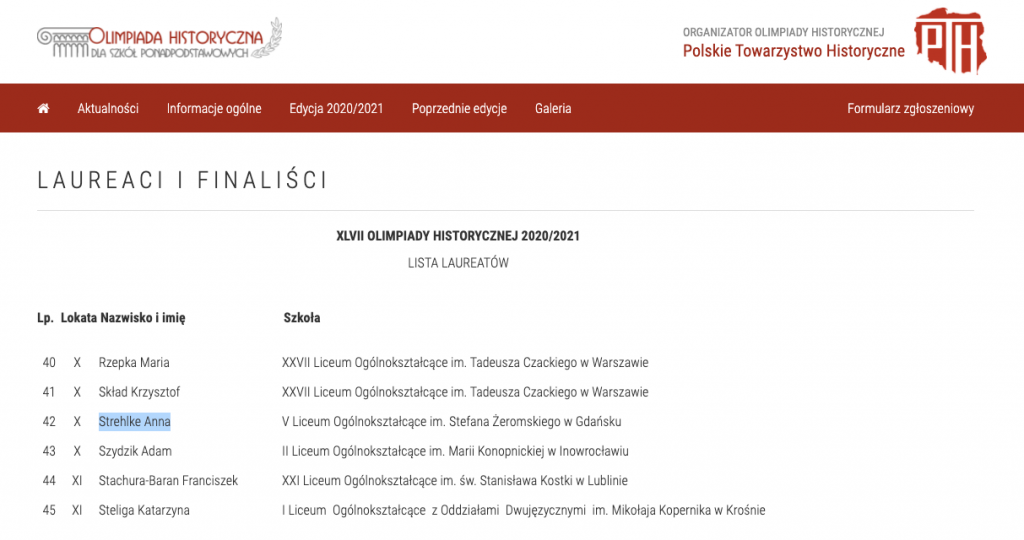 Z ogromną przyjemnością zawiadamiamy, że nasza uzdolniona uczennica Anna Strehlke z klasy 2 Cg została Laureatką XLVII OLIMPIADY HISTORYCZNEJ, zajmując 10 miejsce w Polsce! Warto wspomnieć, że na wcześniejszych etapach dwukrotnie pokonała setki rywali, za każdym razem awansując do grona uczestników z najwyższą punktacją.