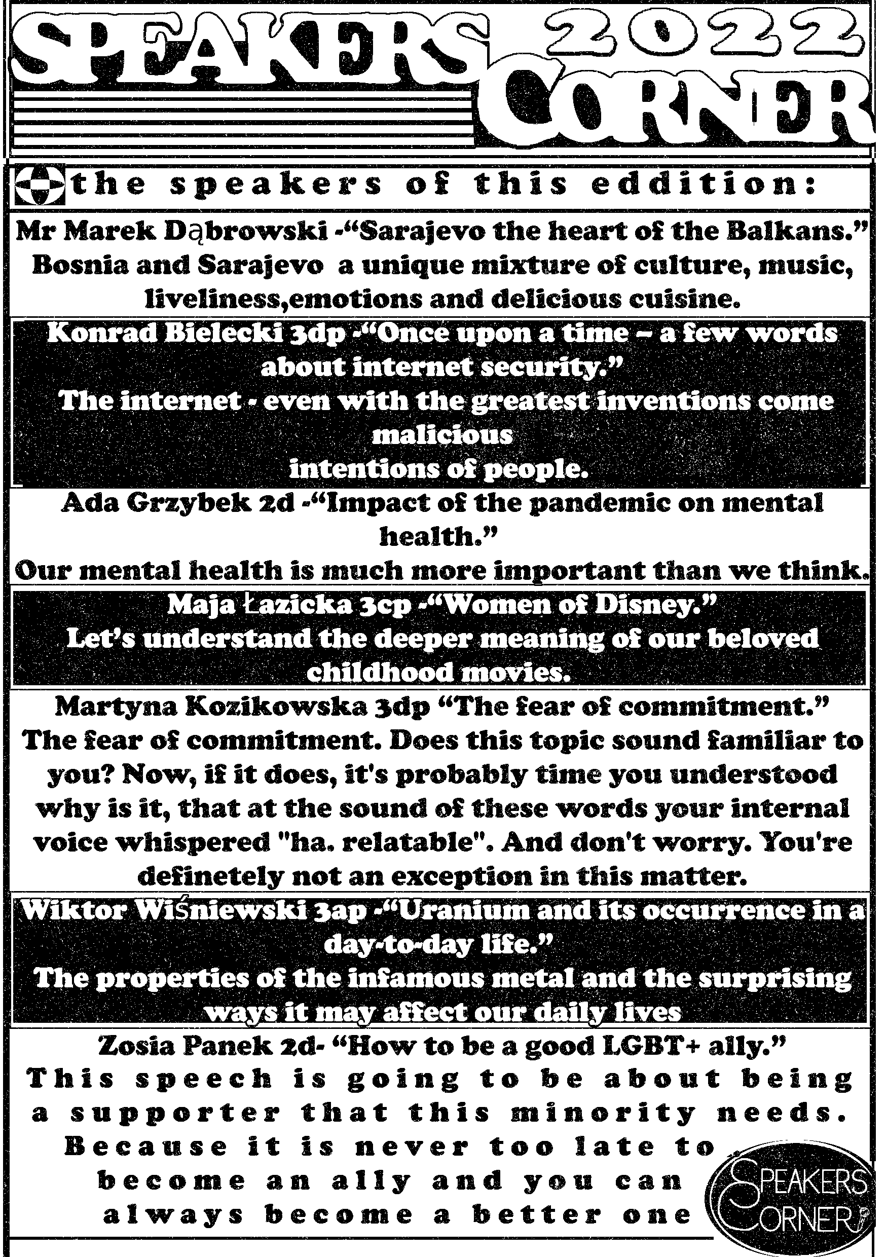 Znamy już mówców najbliższego Speakers Corner. W najbliższy czwartek w godzinach 10:00-12:00 w auli Piątki posłuchamy: