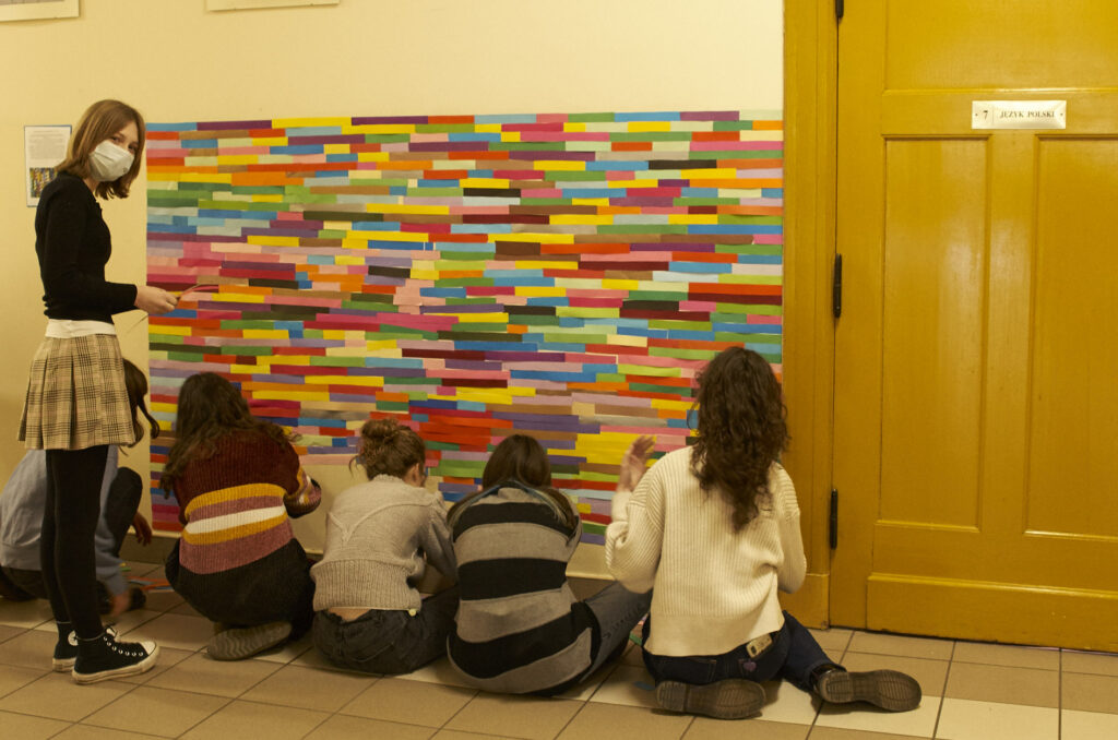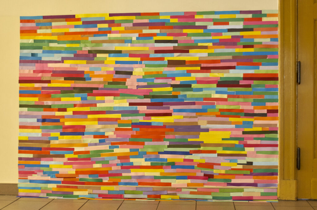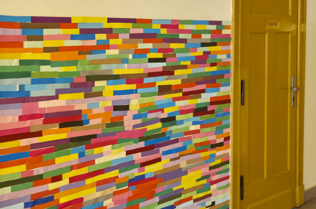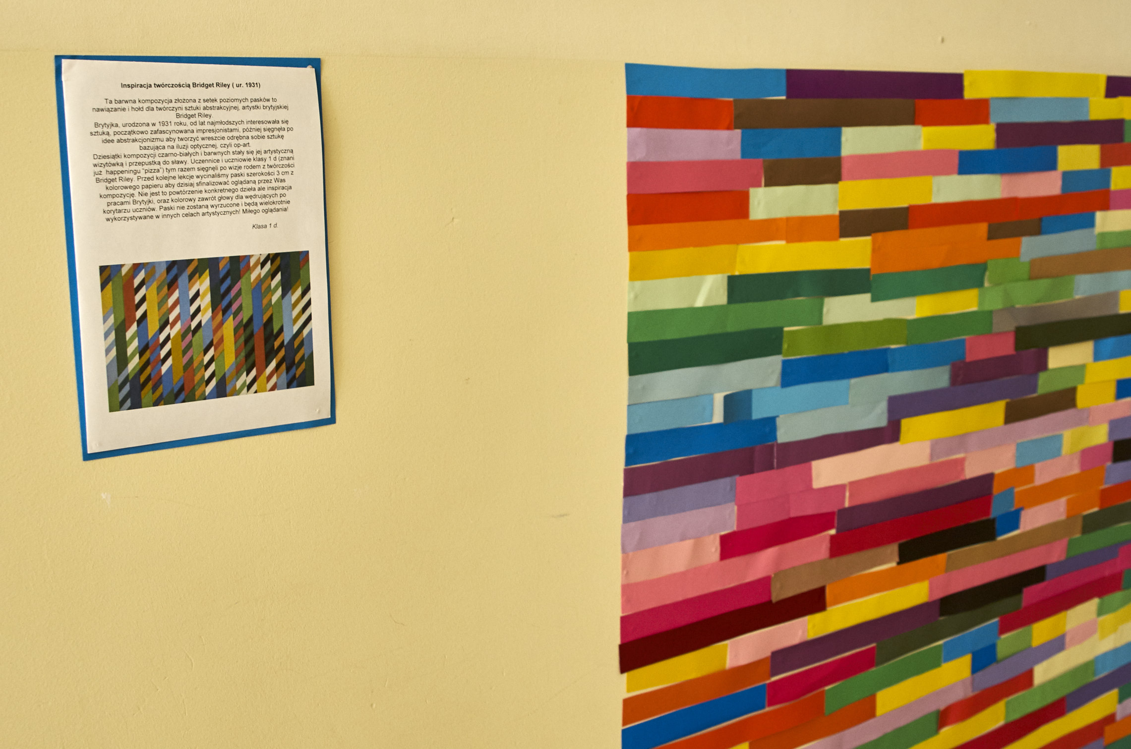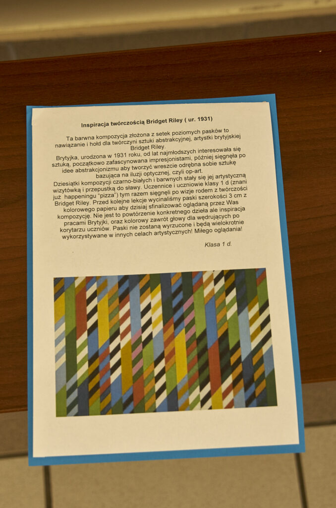 Dziesiątki kompozycji czarno-białych i barwnych stały się jej artystyczną wizytówką i przepustką do sławy. Uczennice i uczniowie klasy 1 d (znani już happeningu “pizza”) tym razem sięgnęli po wizję rodem właśnie z twórczości Bridget Riley. Przed kolejne lekcje wycinaliśmy paski szerokości 3 cm z kolorowego papieru aby dzisiaj, obok sali nr. 7 sfinalizować oglądaną przez Was kompozycję. Nie jest to powtórzenie konkretnego dzieła ale inspiracja pracami Brytyjki, oraz kolorowy zawrót głowy dla wędrujących po korytarzu uczniów. Paski nie zostaną wyrzucone i będą wielokrotnie wykorzystywane w innych celach artystycznych! Kompozycja może też służyć za tło do selfies i być swoistą ścianką artystyczną. Miłego korzystania!