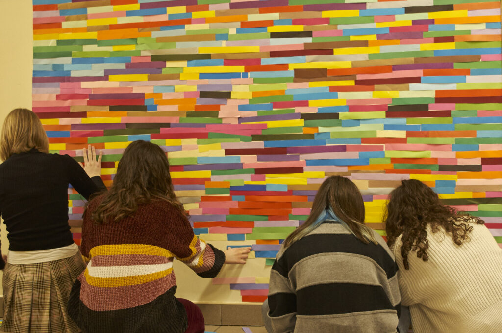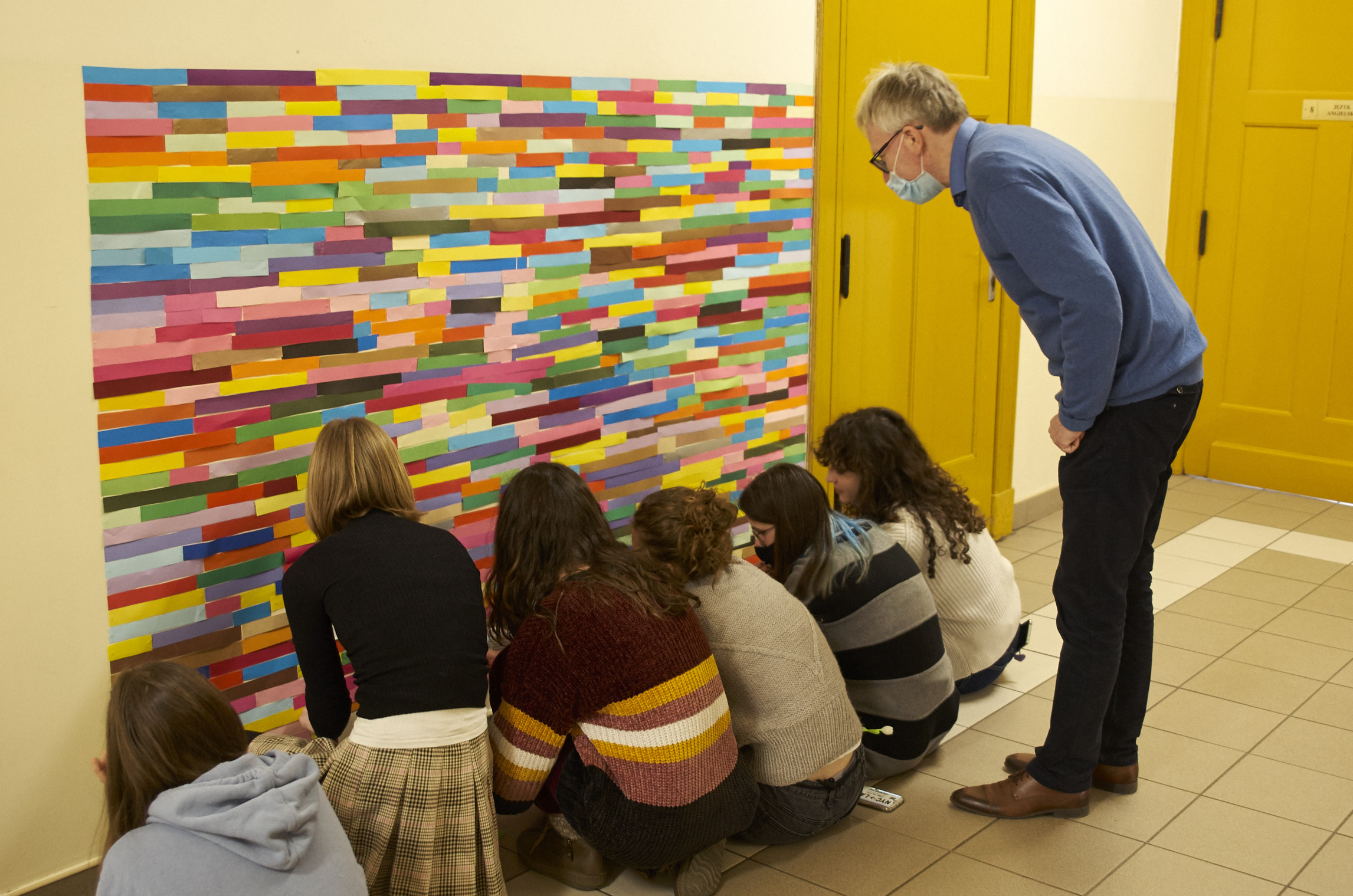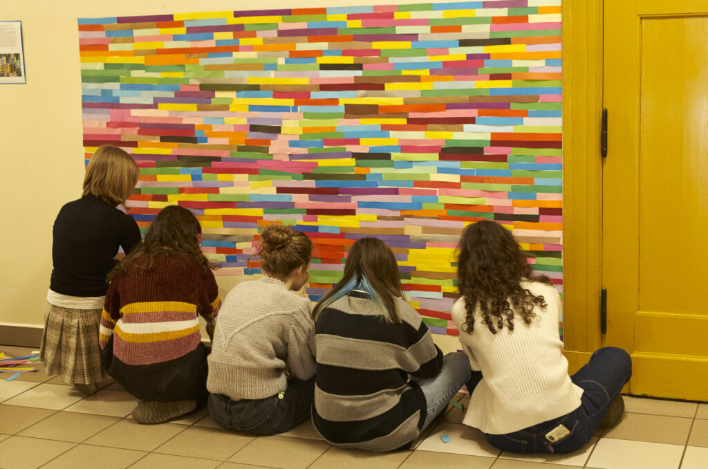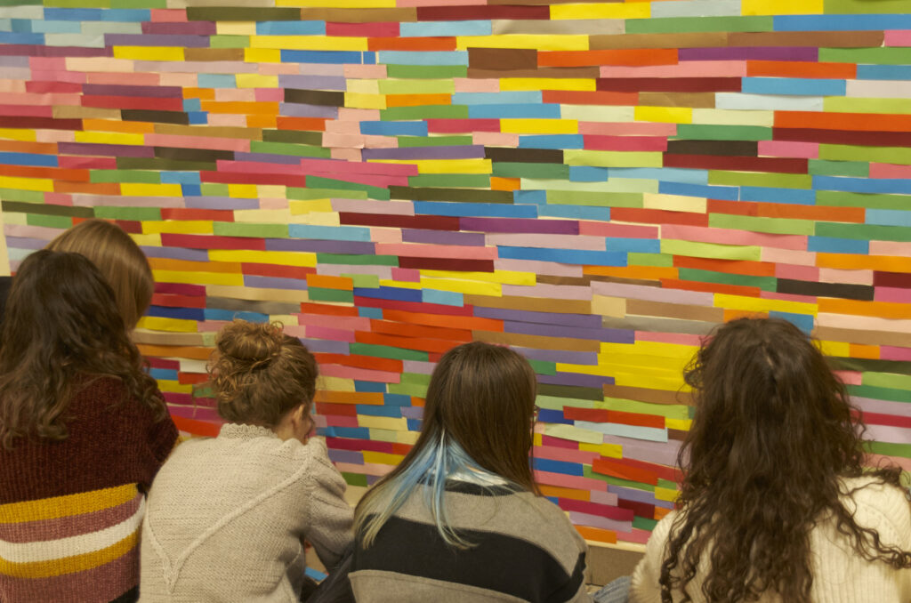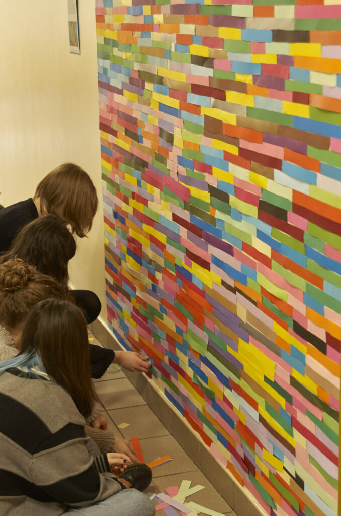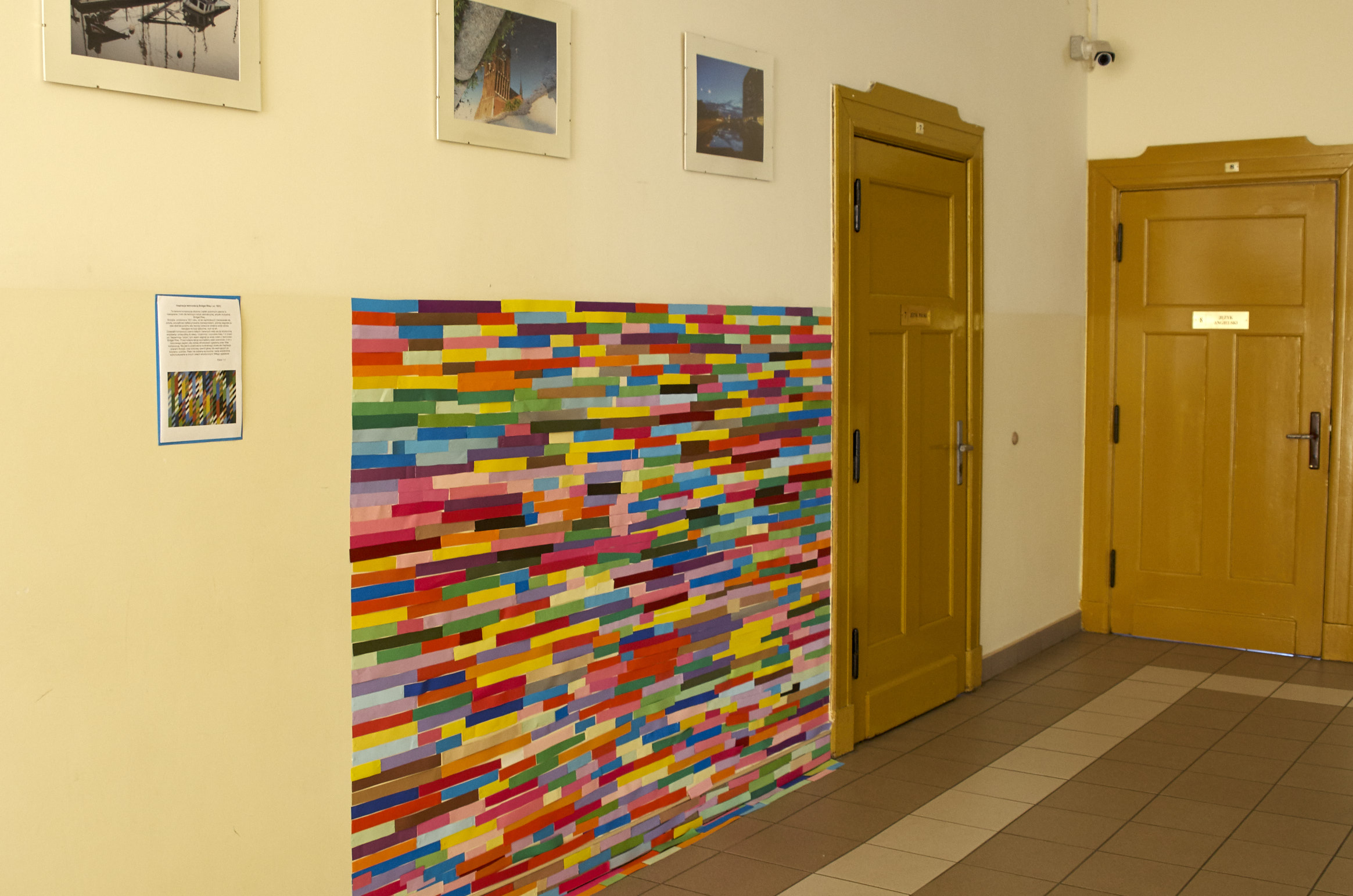 Dziesiątki kompozycji czarno-białych i barwnych stały się jej artystyczną wizytówką i przepustką do sławy. Uczennice i uczniowie klasy 1 d (znani już happeningu “pizza”) tym razem sięgnęli po wizję rodem właśnie z twórczości Bridget Riley. Przed kolejne lekcje wycinaliśmy paski szerokości 3 cm z kolorowego papieru aby dzisiaj, obok sali nr. 7 sfinalizować oglądaną przez Was kompozycję. Nie jest to powtórzenie konkretnego dzieła ale inspiracja pracami Brytyjki, oraz kolorowy zawrót głowy dla wędrujących po korytarzu uczniów. Paski nie zostaną wyrzucone i będą wielokrotnie wykorzystywane w innych celach artystycznych! Kompozycja może też służyć za tło do selfies i być swoistą ścianką artystyczną. Miłego korzystania!