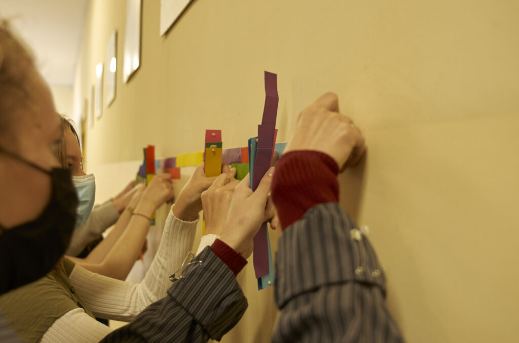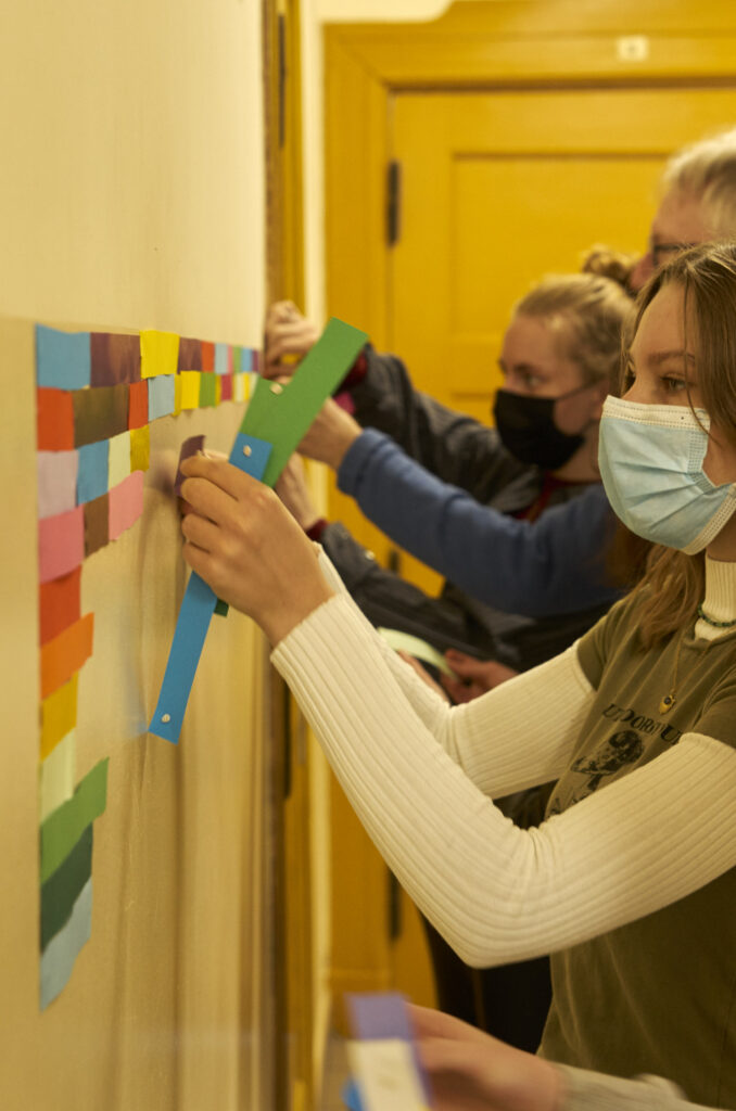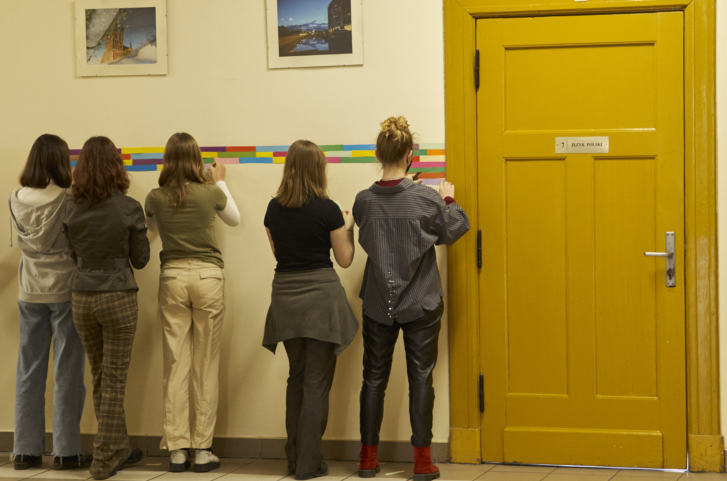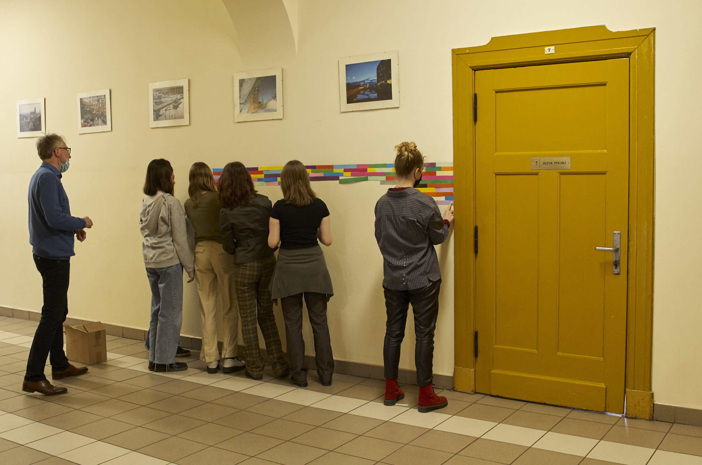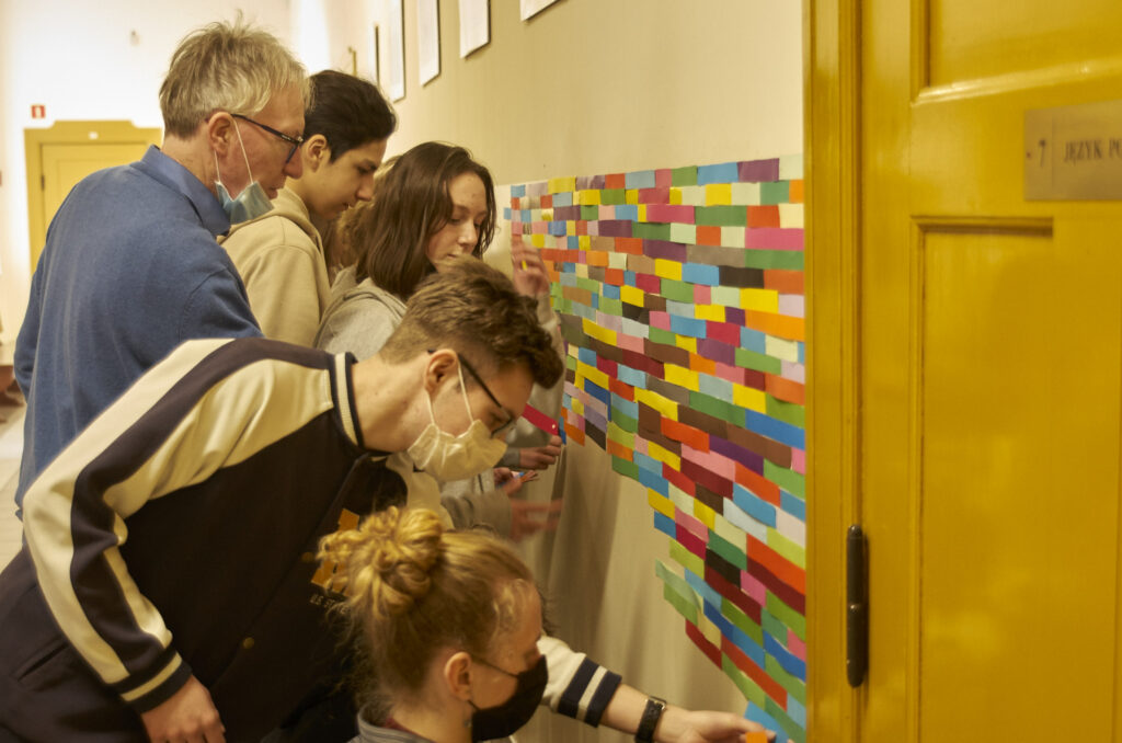 Dziesiątki kompozycji czarno-białych i barwnych stały się jej artystyczną wizytówką i przepustką do sławy. Uczennice i uczniowie klasy 1 d (znani już happeningu “pizza”) tym razem sięgnęli po wizję rodem właśnie z twórczości Bridget Riley. Przed kolejne lekcje wycinaliśmy paski szerokości 3 cm z kolorowego papieru aby dzisiaj, obok sali nr. 7 sfinalizować oglądaną przez Was kompozycję. Nie jest to powtórzenie konkretnego dzieła ale inspiracja pracami Brytyjki, oraz kolorowy zawrót głowy dla wędrujących po korytarzu uczniów. Paski nie zostaną wyrzucone i będą wielokrotnie wykorzystywane w innych celach artystycznych! Kompozycja może też służyć za tło do selfies i być swoistą ścianką artystyczną. Miłego korzystania!