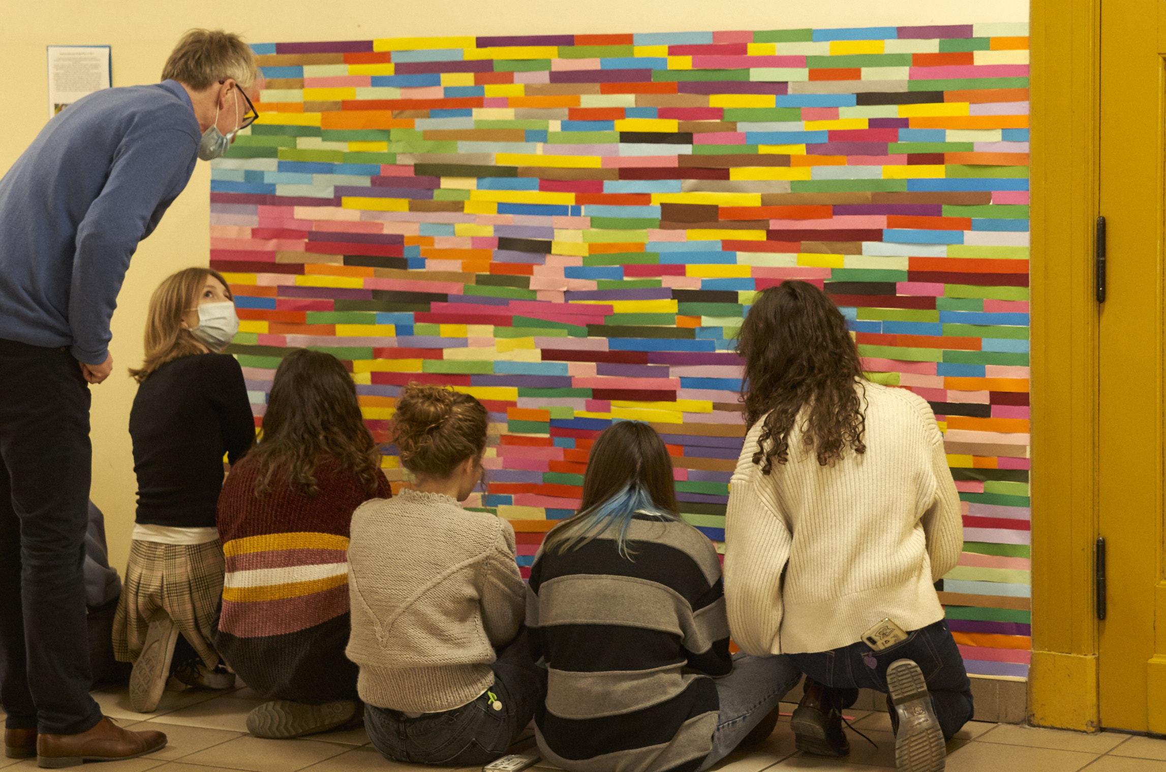 Barwna kompozycja, którą widzicie na fotografiach, złożona z setek poziomych pasków to nawiązanie i hołd dla twórczyni sztuki abstrakcyjnej, artystki brytyjskiej Bridget Riley.