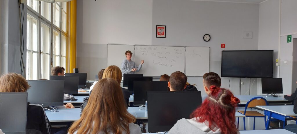 Absolwent Piątki klasy matematyczno-fizyczno-informatycznej, student Meterology and Oceanography University od East Anglia, Jakub Lewandowski na dwa dni stanął przy tablicy lub przy komputerze, gdzie zazwyczaj stoi lub siedzi nauczyciel. W dwa dni, 4 i 5 kwietnia uczniom klas 3Bp i 3Bg przekazywał swoje doświadczenie studiowania za granicą oraz wyjaśniał zagadnienia z metod numerycznych w meteorologii. Uczniowie uczestniczyli w wykładzie i mogli wspólnie stworzyć program w pythonie z wykorzystaniem prezentowanych zagadnień i to w języku angielskim.
