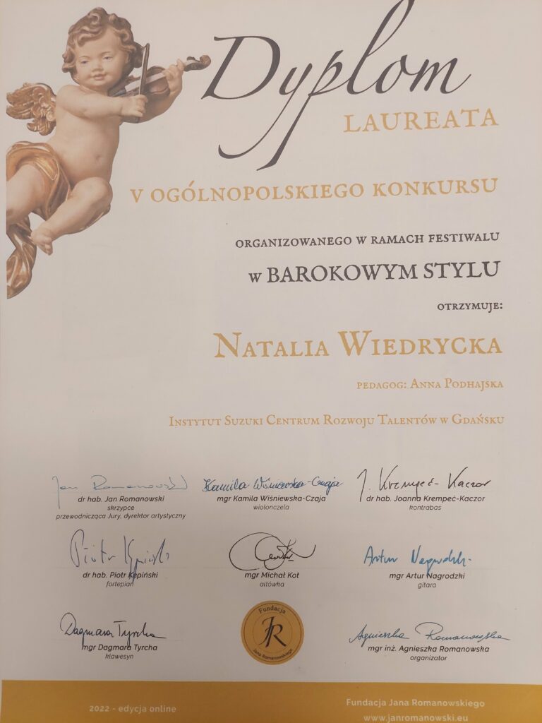 W piątej edycji ogólnopolskiego konkursu w ramach festiwalu w BAROKOWYM STYLU uczennica klasy 1 a Natalia Wiedrycka otrzymała tytuł laureata.