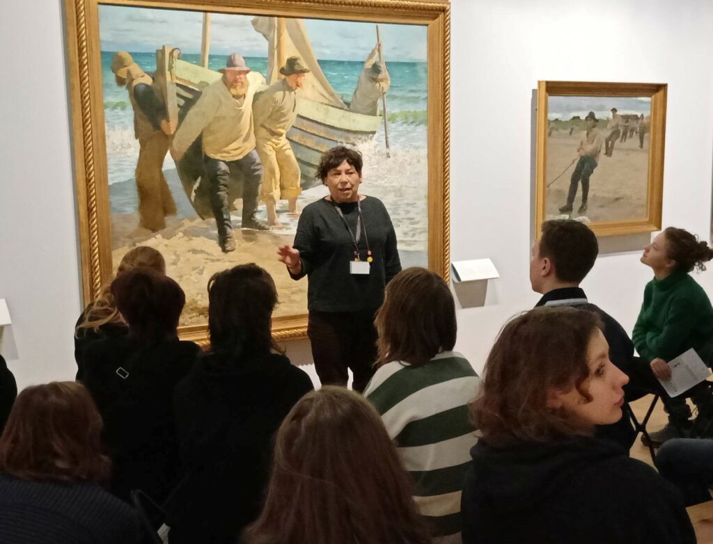 Nasza grupa miała okazję zapoznać się ze sztuką krajów północy, czyli Danii, Norwegii, Szwecji i Finlandii (która nie należy do krajów skandynawskich). Dzieła zachwyciły nas urodą surowej przyrody, niezwykłymi ujęciami postaci, realizmem warsztatu, ale też symboliką i nastrojowością. Widoczna za naszą wspaniałą panią przewodnik kompozycja z rybakami na plaży to przykład pracy pejzażystów szwedzkich malujących w modnej wówczas wśród artystów osadzie Skagen. Z kolei portret kobiety ujętej zza pleców to jedno z dzieł wyśmienitego artysty działającego na pograniczu romantyzmu i realizmu Vilhelma Hammershoi. Cała grupa sportretowała się jeszcze przed wejściem do gmachu muzeum, by tradycyjnie uwiecznić kolejny wyjazd, zaś postać autora tego tekstu w eleganckiej dioramie (inspirowana obrazem Richarda Bergh`a) przypomina, że sztuka jest zawsze blisko nas.