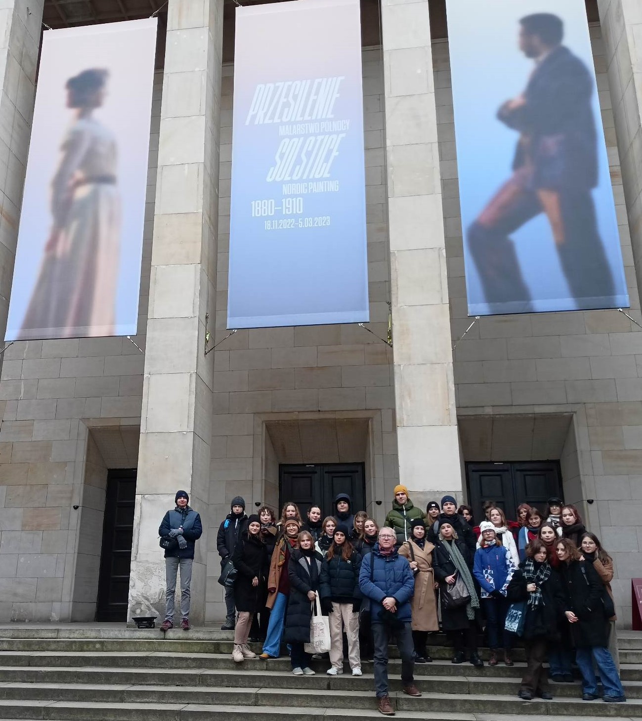 Nasza grupa miała okazję zapoznać się ze sztuką krajów północy, czyli Danii, Norwegii, Szwecji i Finlandii (która nie należy do krajów skandynawskich). Dzieła zachwyciły nas urodą surowej przyrody, niezwykłymi ujęciami postaci, realizmem warsztatu, ale też symboliką i nastrojowością. Widoczna za naszą wspaniałą panią przewodnik kompozycja z rybakami na plaży to przykład pracy pejzażystów szwedzkich malujących w modnej wówczas wśród artystów osadzie Skagen. Z kolei portret kobiety ujętej zza pleców to jedno z dzieł wyśmienitego artysty działającego na pograniczu romantyzmu i realizmu Vilhelma Hammershoi. Cała grupa sportretowała się jeszcze przed wejściem do gmachu muzeum, by tradycyjnie uwiecznić kolejny wyjazd, zaś postać autora tego tekstu w eleganckiej dioramie (inspirowana obrazem Richarda Bergh`a) przypomina, że sztuka jest zawsze blisko nas.