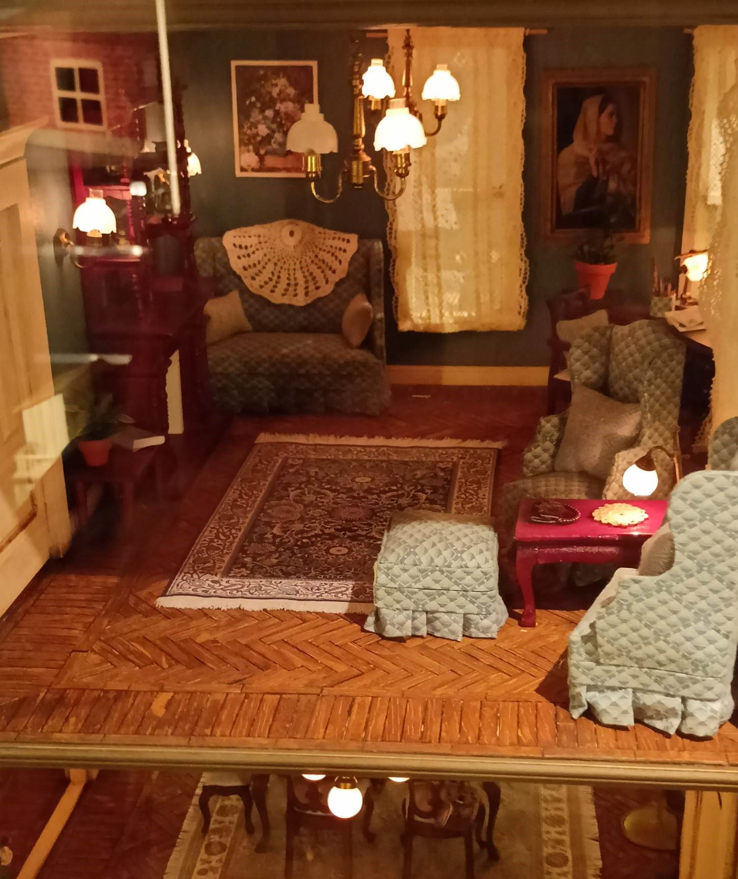 Dopełnieniem wyjazdu było zwiedzenie wyjątkowej ekspozycji Domków dla lalek i zabawek z czasów waszych rodziców, oraz babć i dziadków. Podziwialiśmy kunsztowne miniatury ścian, dachów, wnętrz, aż po najmniejsze drobiazgowo odtworzone sprzęty. Nie domyślilibyście się, że salon, który widzicie na zdjęciu ma naprawdę tylko kilkanaście centymetrów wysokości i…elektryczne oświetlenie!