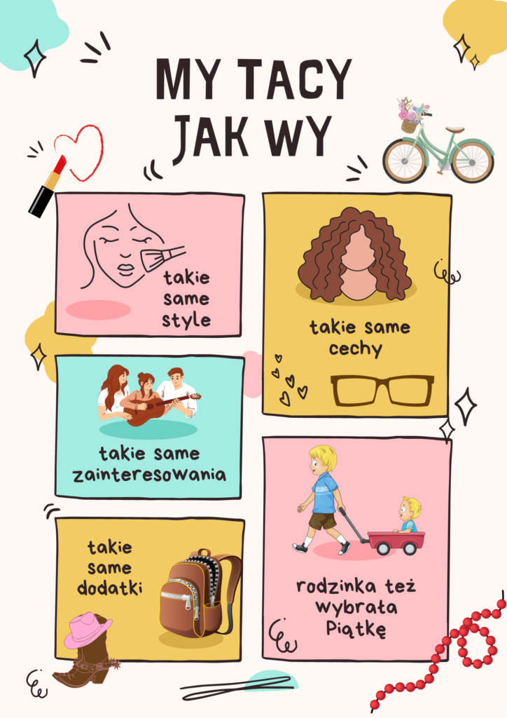 Wybierz z listy cechę lub rzecz, z którymi się utożsamiasz (możesz wybrać więcej niż jedna). Staw się z nią (tą cechą lub rzeczą) w wyznaczonym dniu do grupowego zdjęcia w AULI. Będzie tam na Ciebie czekał nauczyciel “pierwowzór” oraz gang uczniów, którzy wybrali tak samo.