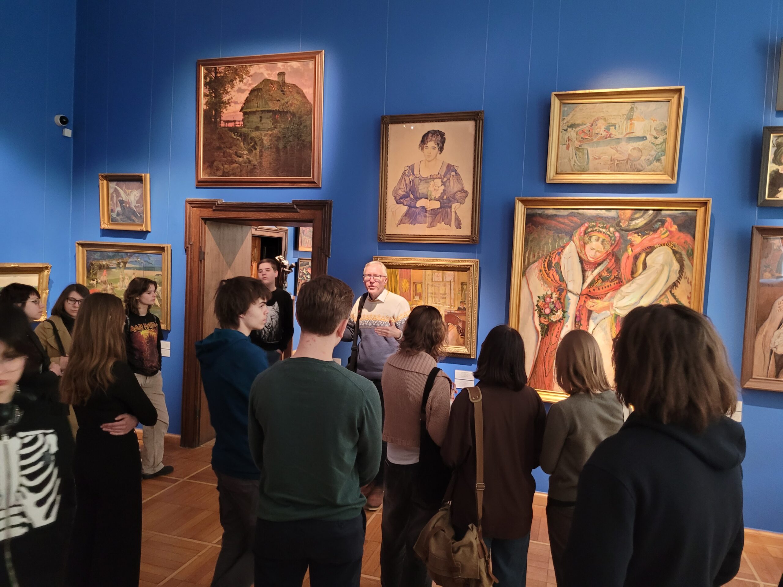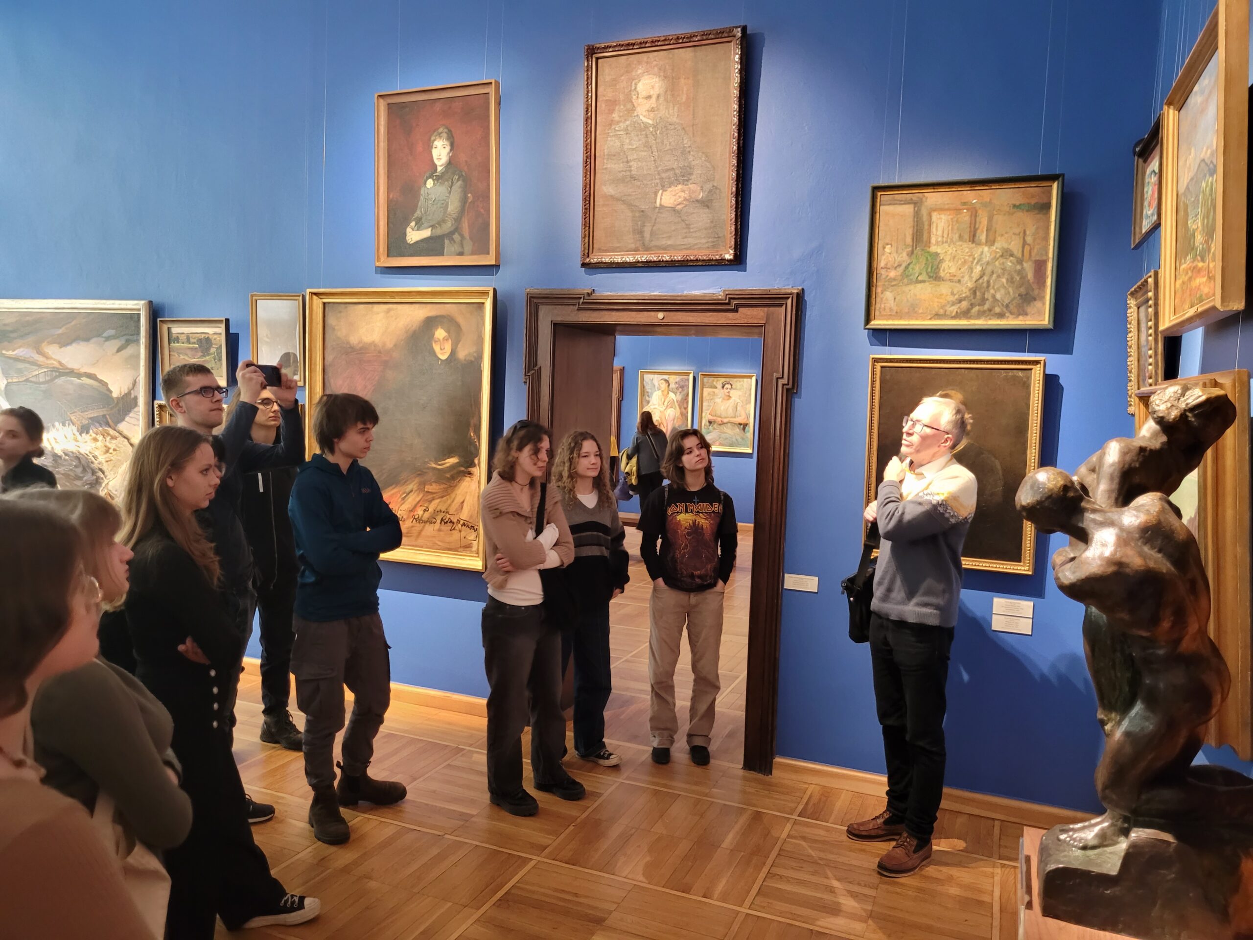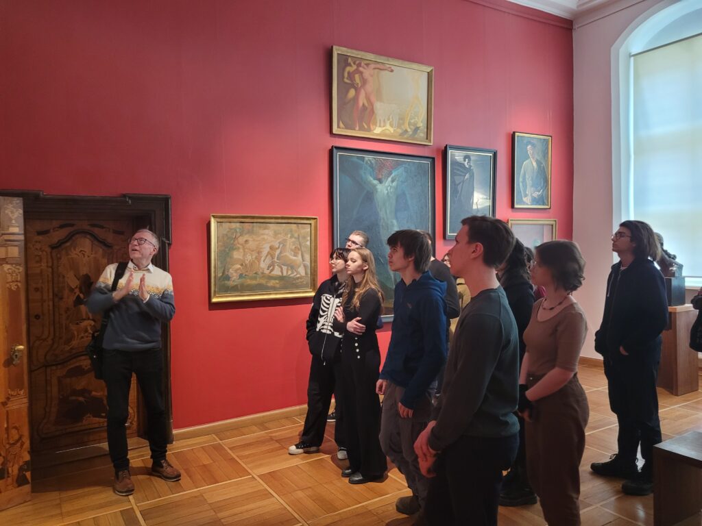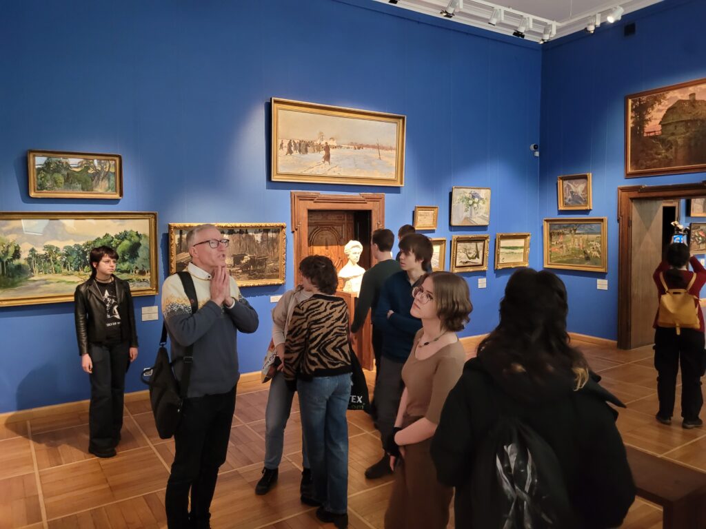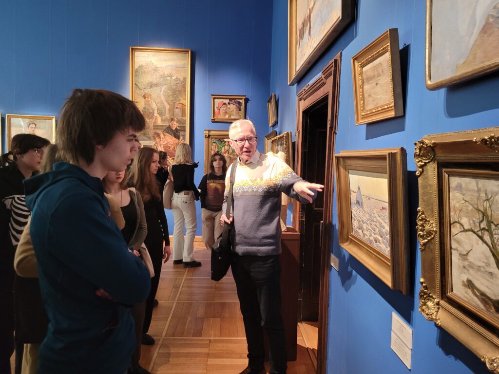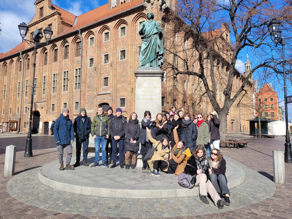 Pomimo lodowatego wiatru nie mogliśmy sobie odmówić tradycyjnego dla naszych wypraw, wspólnego zdjęcia- tym razem pod pomnikiem Mikołaja Kopernika. Astronom, który dawno temu „wstrzymał Słońce” teraz niestety nie pomógł w przypadku mało wiosennej pogody, więc natychmiast udaliśmy się do ciepłych pomieszczeń muzealnych. Mało kto wie, ze są tam zgromadzone mniej znane dzieła takich twórców jak wspomnieni już wcześniej, a ponadto np. Józef Mehoffer, Józef Pankiewicz (polski impresjonista), czy Julian Fałat, mistrz pejzaży zimowych.