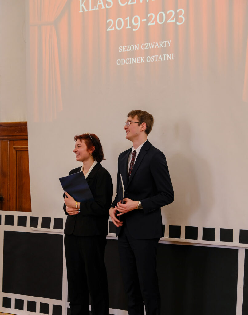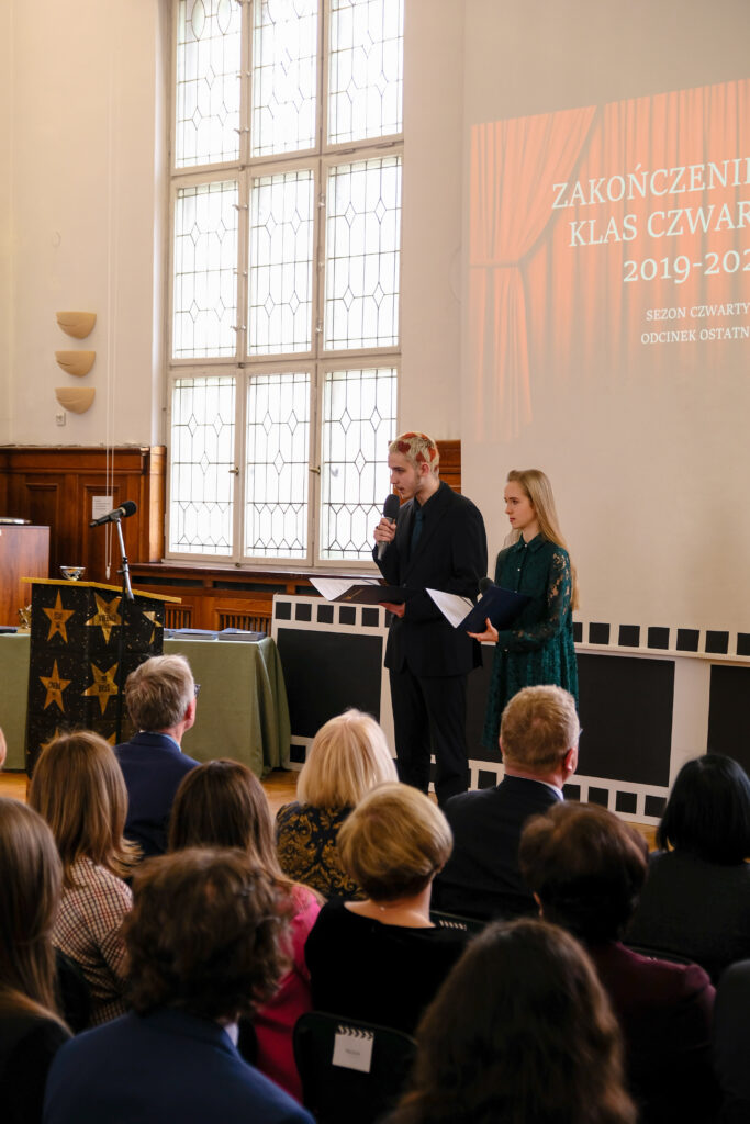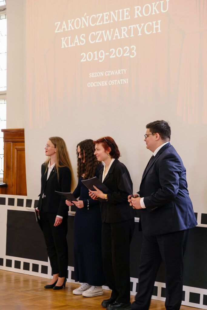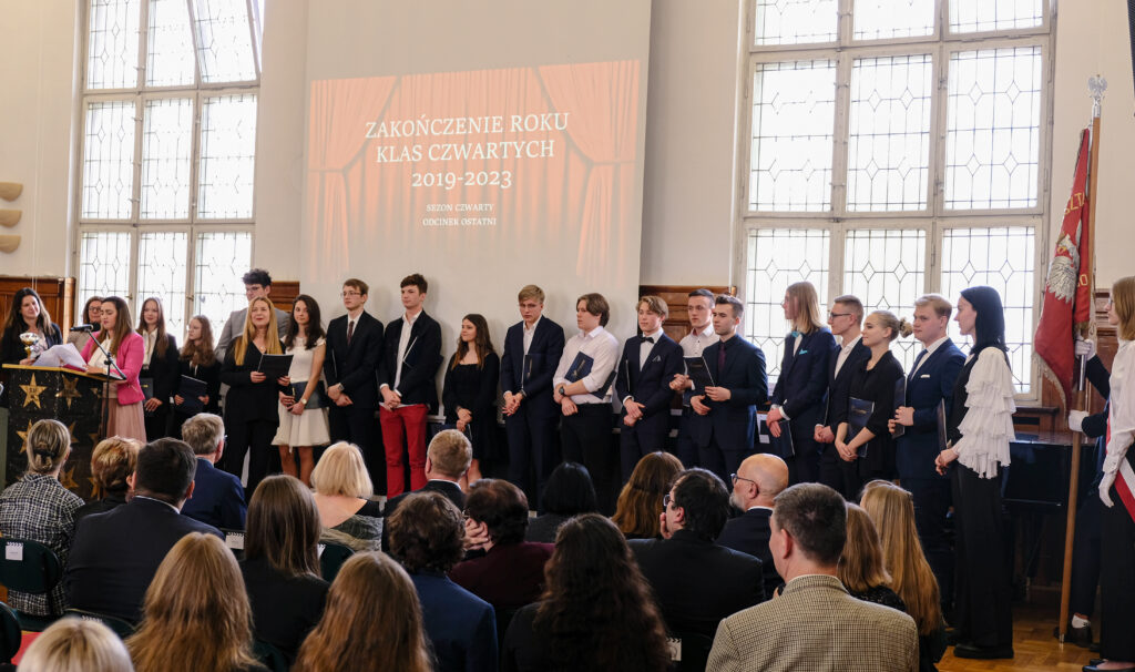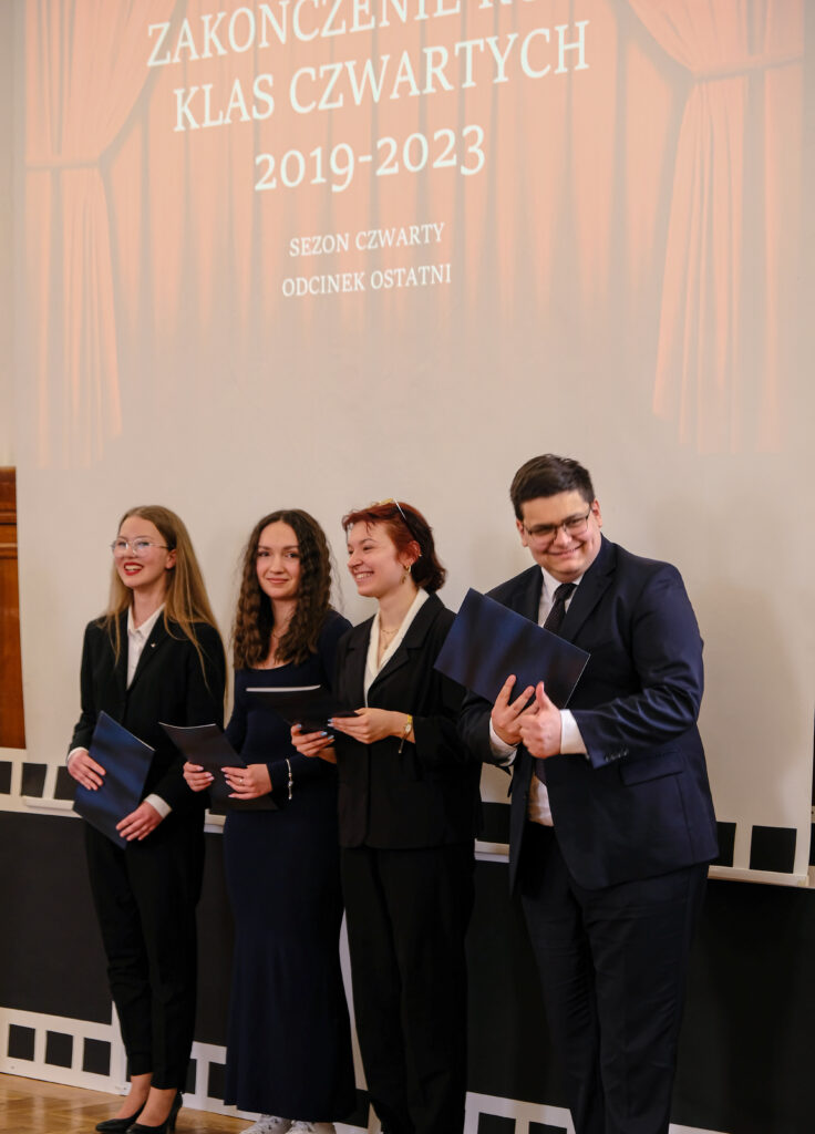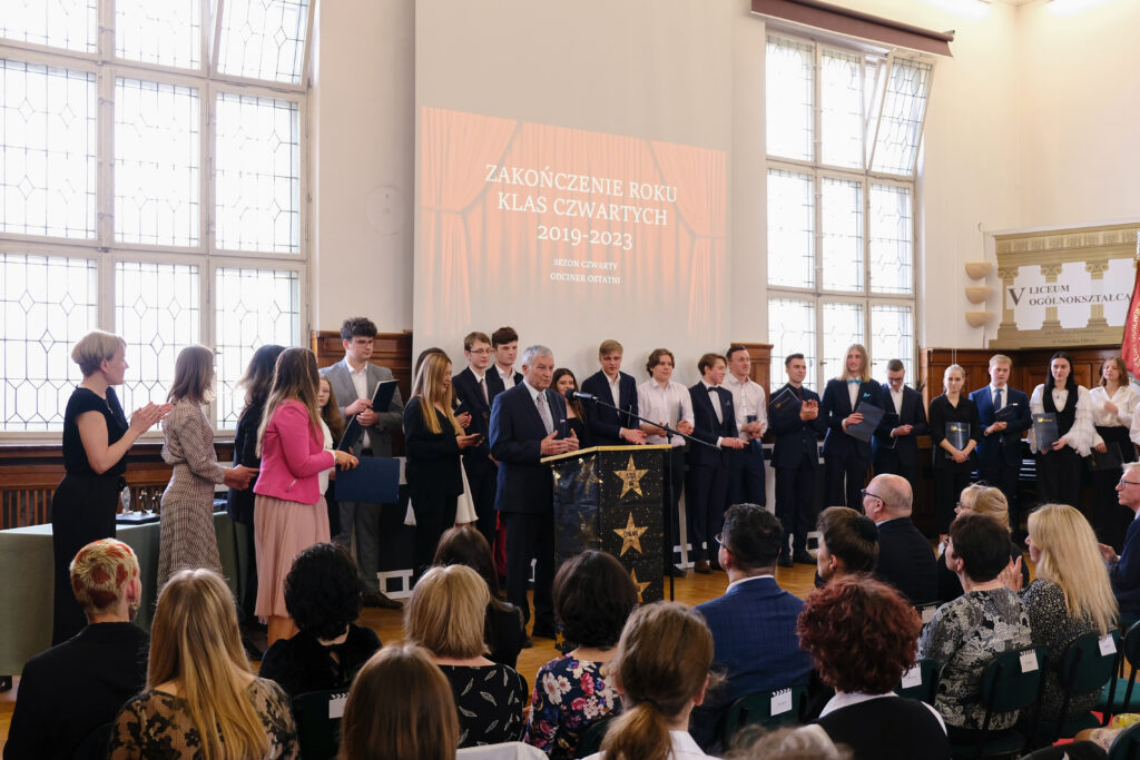 Słowo pożegnanie brzmi zawsze smutno, ale tego dnia wszyscy postarali się, aby dzień 28 kwietnia został zapamiętany jako radosny, pełen wzruszeń i na pewno wyjątkowy. Po czterech latach nauki zarówno zdalnej jak i stacjonarnej, pośród niepewności jutra, zmian przepisów i zaskakującej rzeczywistości, uczennice i uczniowie klas czwartych po raz ostatni jako uczniowie V LO spotkali się we wspólnym gronie w auli szkoły.