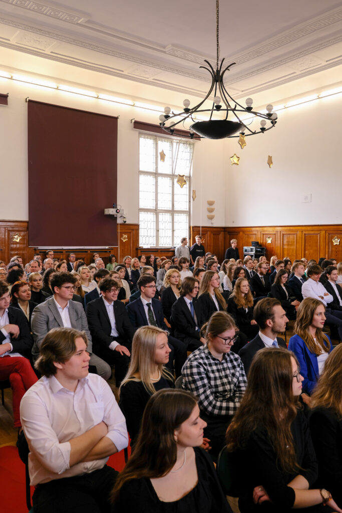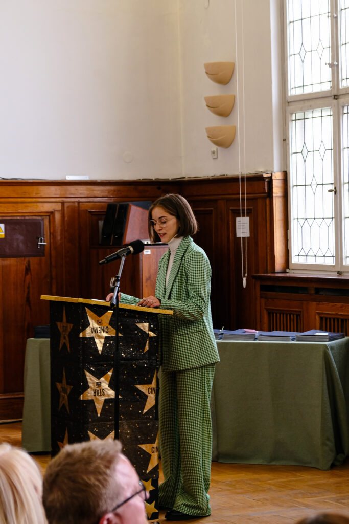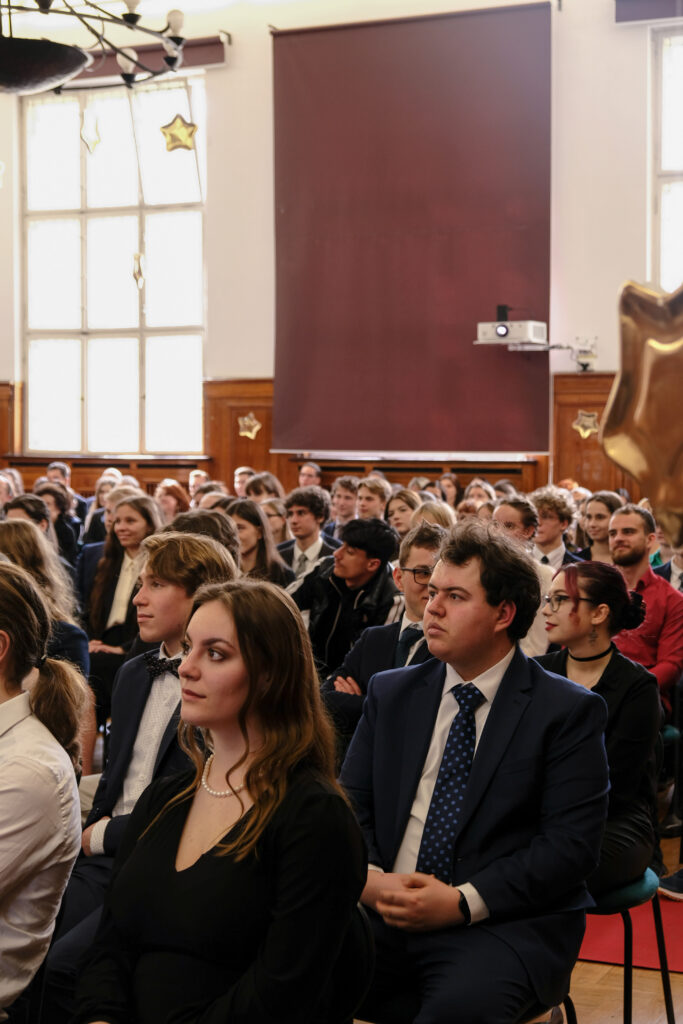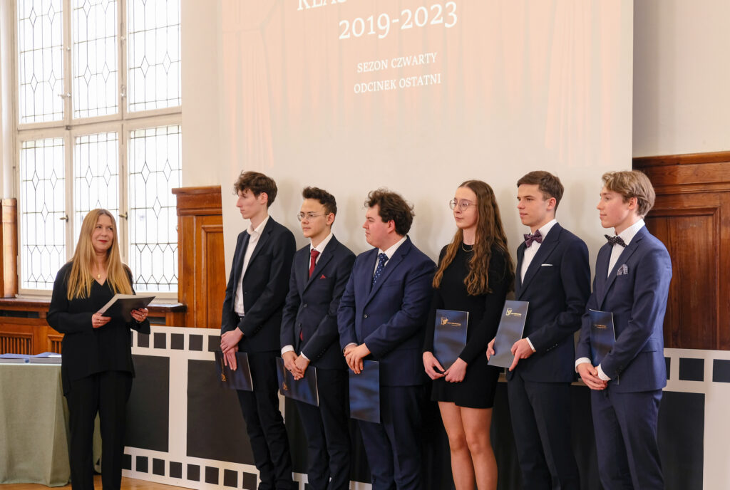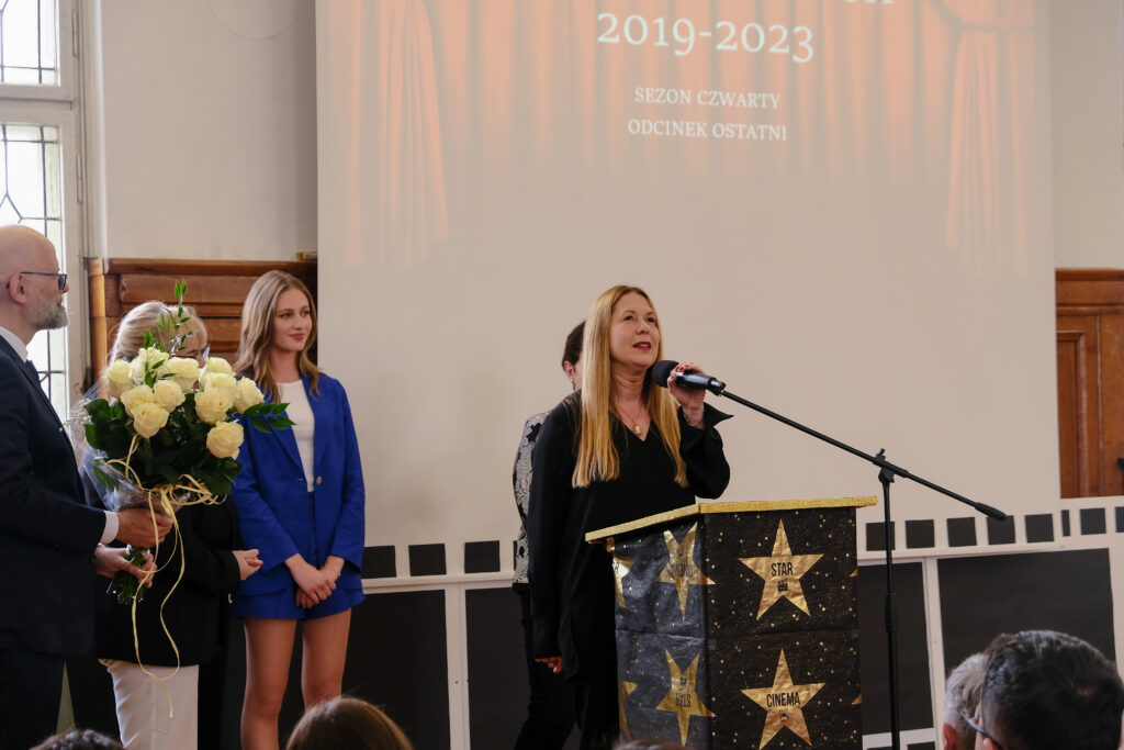 Aula na ten dzień przystroiła się w iście hollywodzki kostium, zaś warto dodać, że już dużo wcześniej inspiratorką takiego filmowego klimatu na uroczystość zakończenie nauki maturzystów stała się pani prof. Bożena Kudrycka. Klasa III a, idąc konsekwentnie tym tropem pod czujnym okiem wychowawczyni, p. prof. Joanny Rześniowieckiej zorganizowała perfekcyjne i wzruszające widowisko prowadzone od A do Z przez zaangażowanych i utalentowanych uczniów naszego biol-chemu. Czerwone dywany, złote gwiazdy, monumentalna taśma filmowa, stroje adekwatne do filmowej gali, płynność i punktualność zdarzeń pozwoliły naszym najważniejszym gościom – czwartoklasistkom i czwartoklasistom poczuć się niemal jak w sali Kodak Theatre w LA. Usadzeni na dedykowanych imiennie krzesłach odbierali nagrody i oklaskiwali swoje koleżanki i swoich kolegów, a sukcesów jak widzieliśmy było co niemiara. Zachwycały krótkie, treściwe przemówienia; dyrekcji szkoły, Jego Magnificencji rektora Politechniki Gdańskiej, przedstawicieli SU, przedstawiciela rodziny Janusza Sidło….