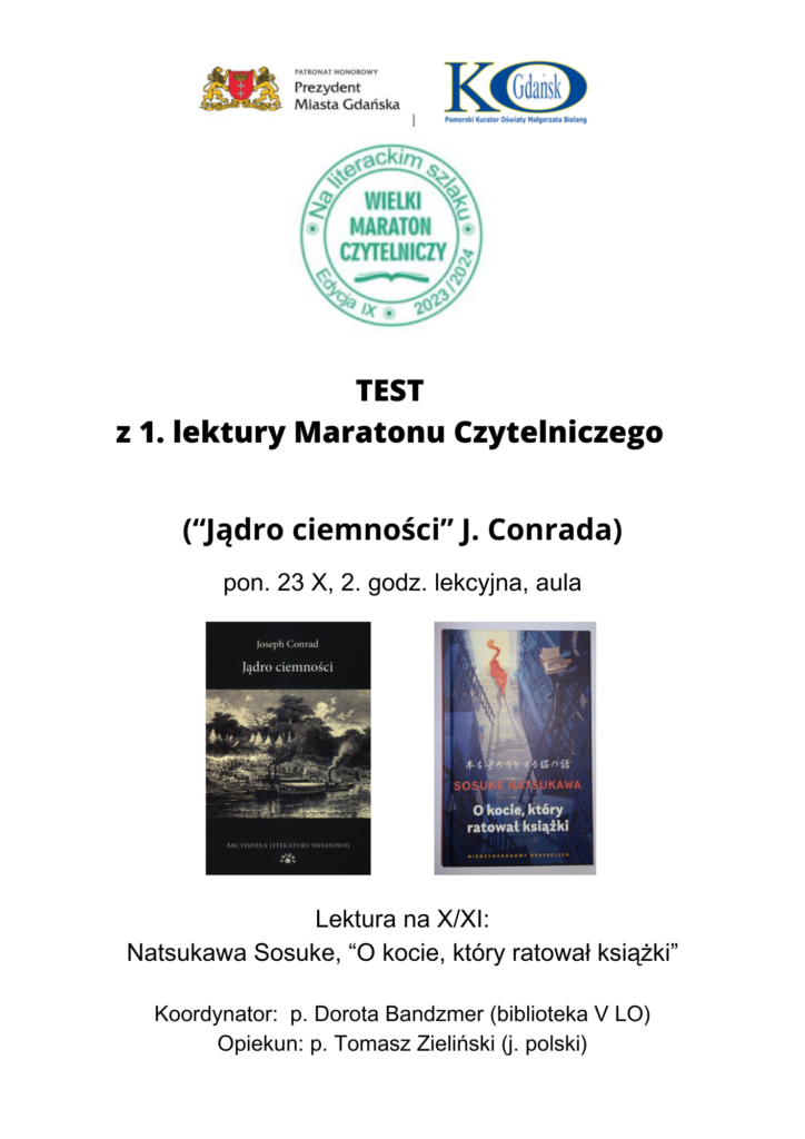 Na test z pierwszej lektury Maratonu Czytelniczego Na Literackim Szlaku zapraszamy w poniedziałek 23 października, na 2. godzinie lekcyjnej do auli szkoły.