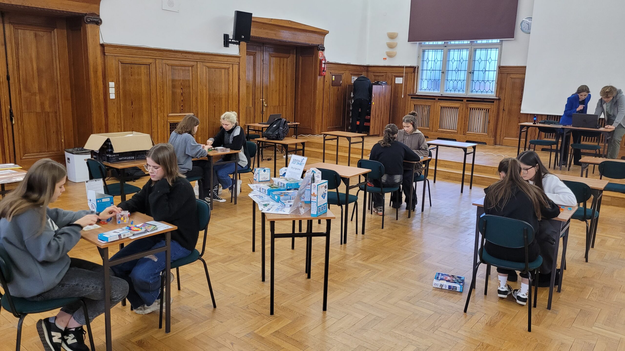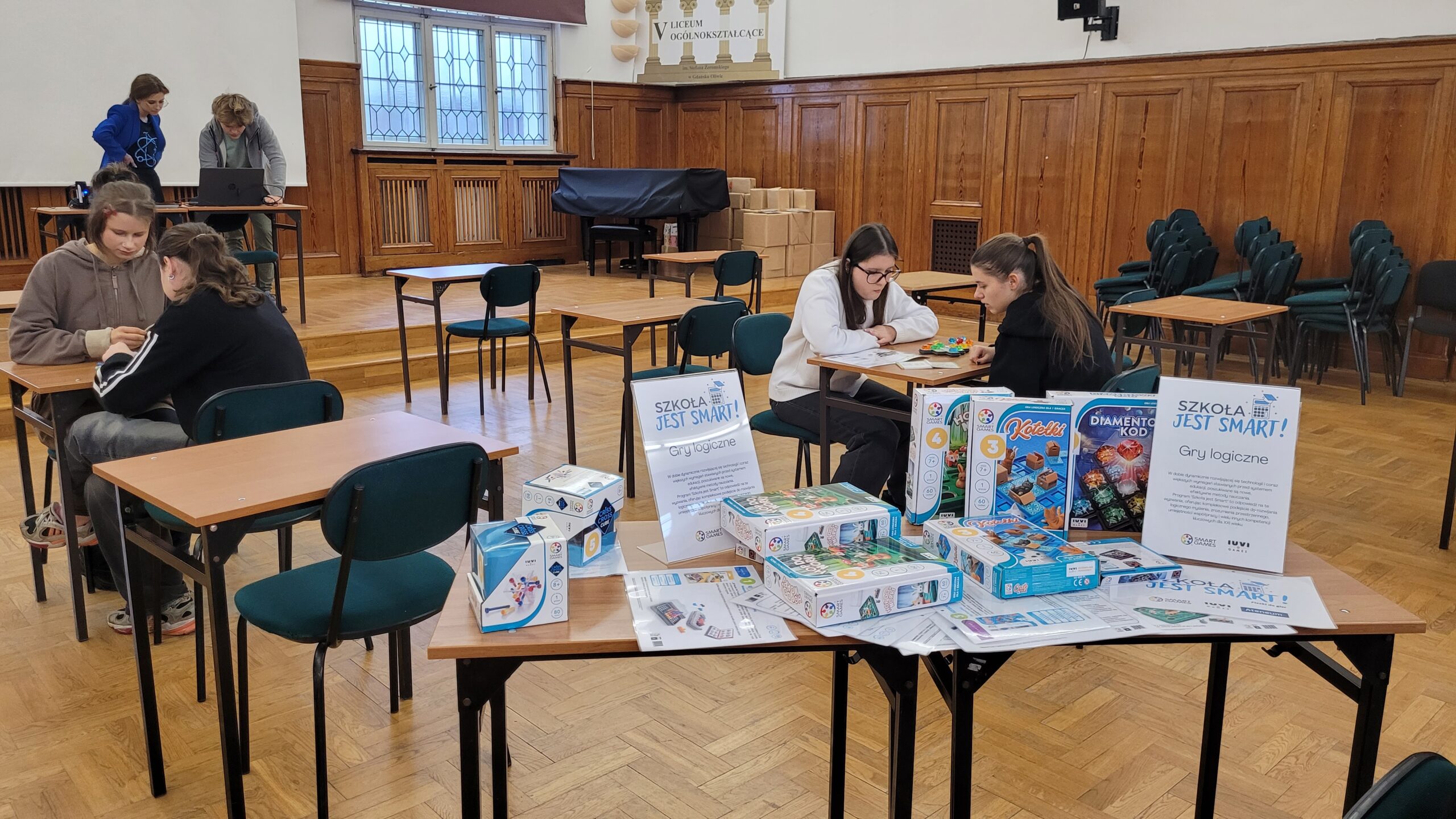 W sali gimnastycznej, w sali informatycznej, w auli i w bibliotece czyli gdzie się da i kiedy się da, można bawić się logicznymi grami.