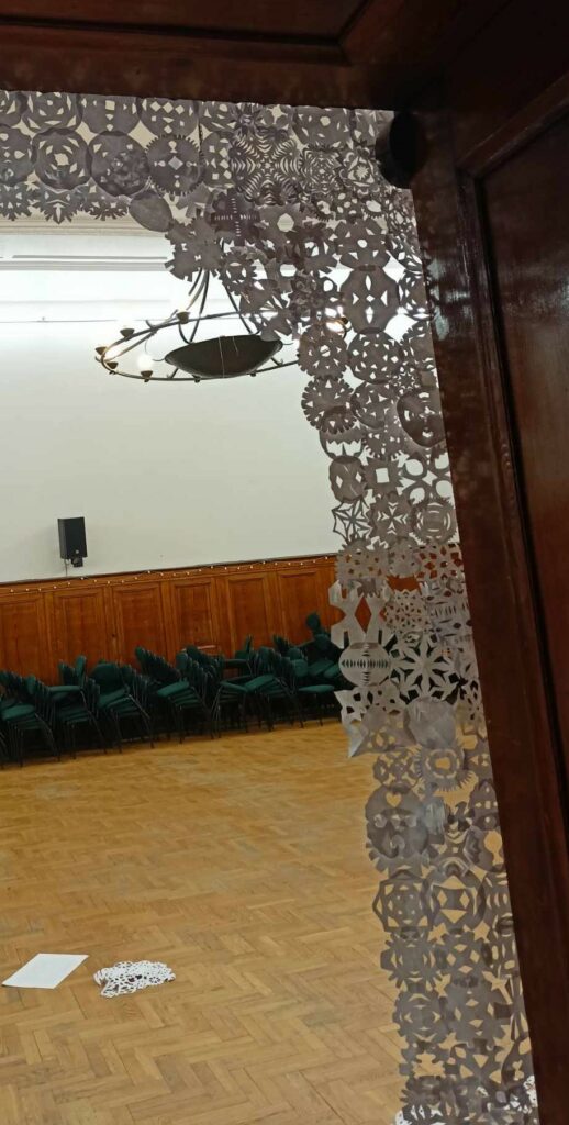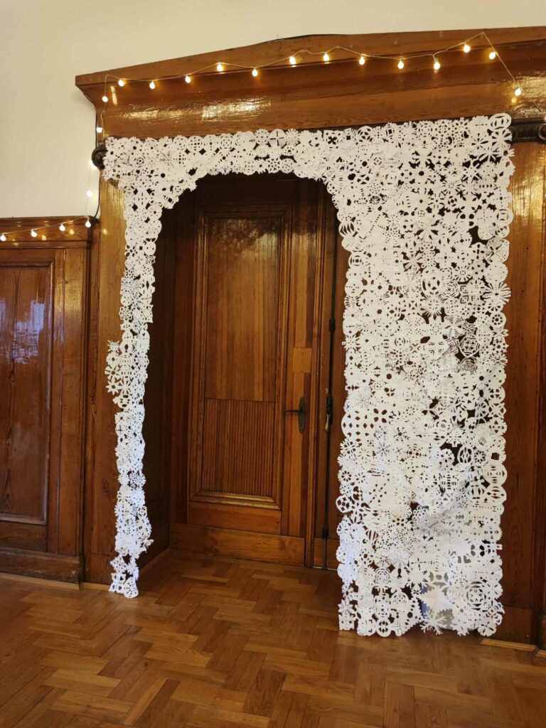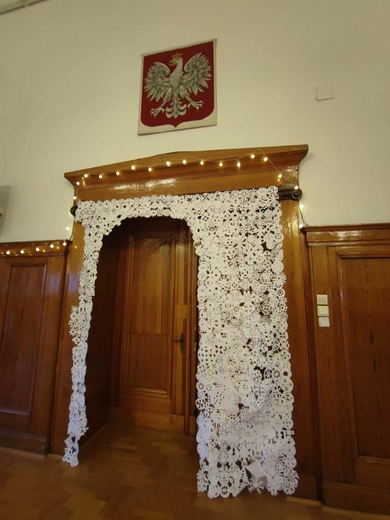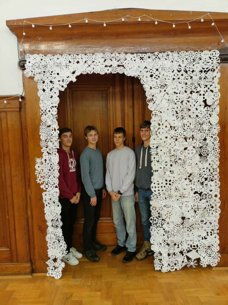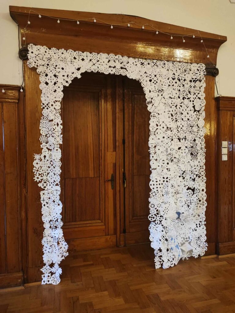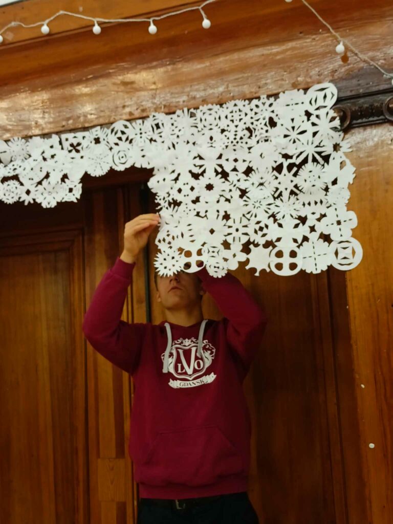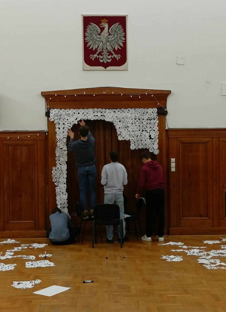 Od co najmniej połowy listopada uczennice i uczniowie klas pierwszych na lekcjach plastyki pracowicie wycinali dziesiątki papierowych śnieżynek. Pytanie; po co? Otóż, postanowiliśmy z tej mozolnej pracy uczynić kolejną, szkolną instalację artystyczną, tym razem w drzwiach naszej poczciwej auli. Gdy już wszystkie gwiazdeczki zostały powycinane, czterech zaradnych Elfów z klasy pierwszej B zbudowało ozdobne otoczenie aulowych wrót, przez które możemy teraz , jeszcze przed Świętami wkraczać do największej sali w szkole. Czy się podoba? Musicie orzec sami! Tymczasem Wesołych i oby również artystycznych Świąt! do kolejnych twórczych działań, już w Nowym 2024 Roku!