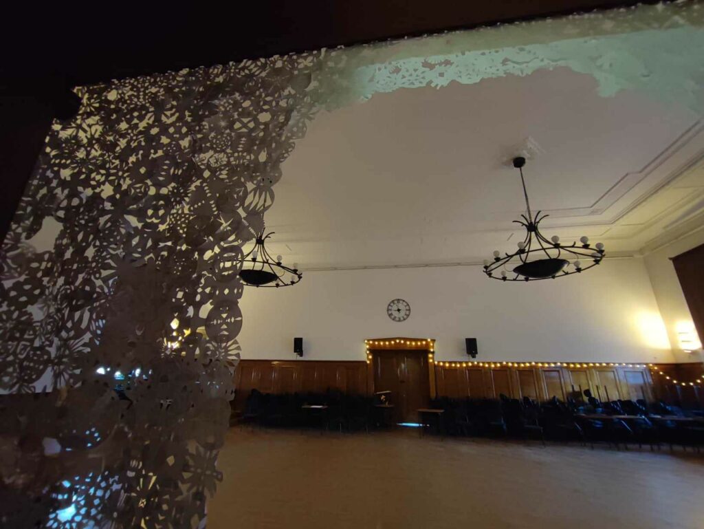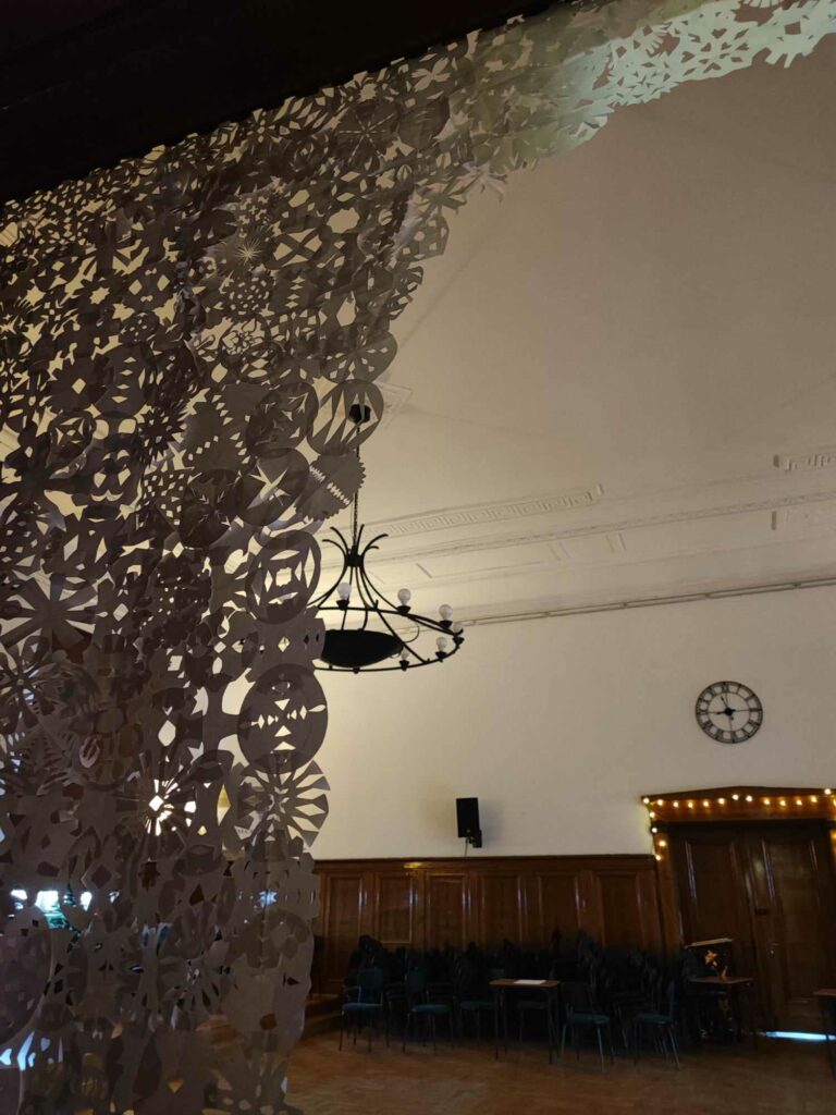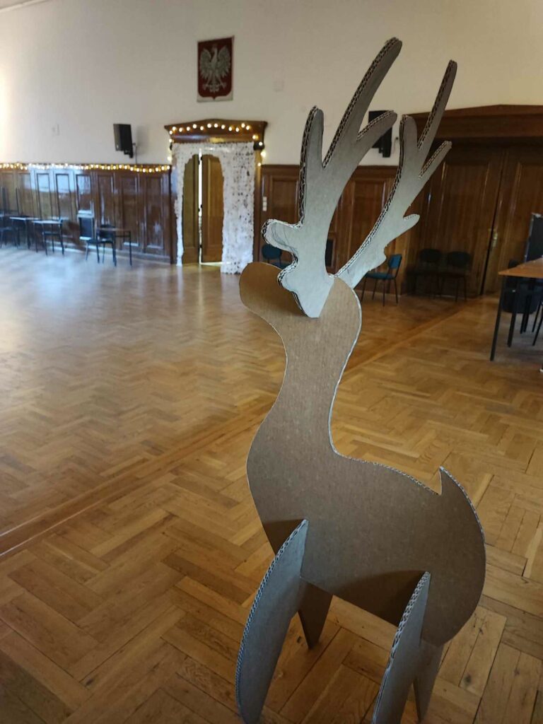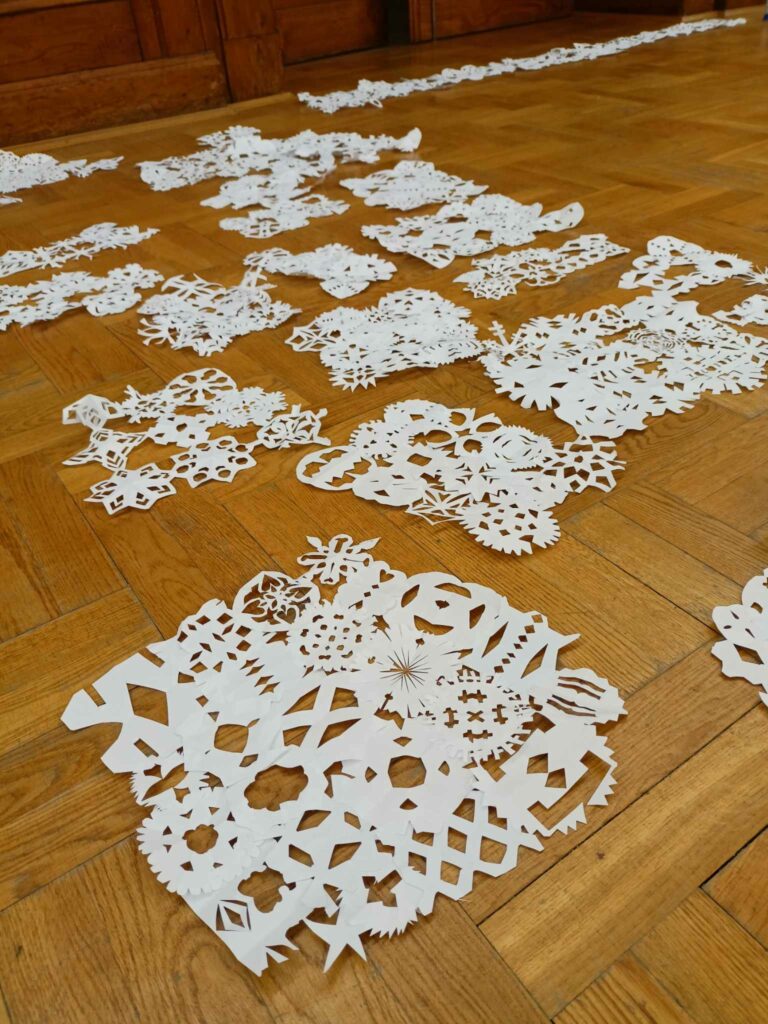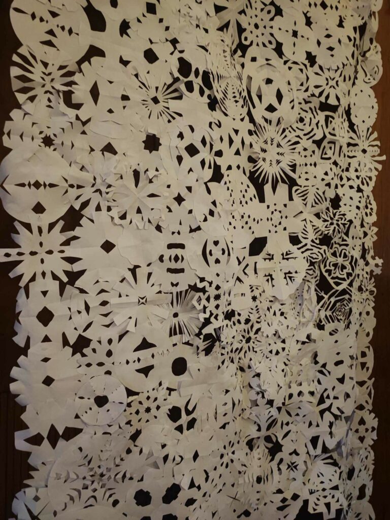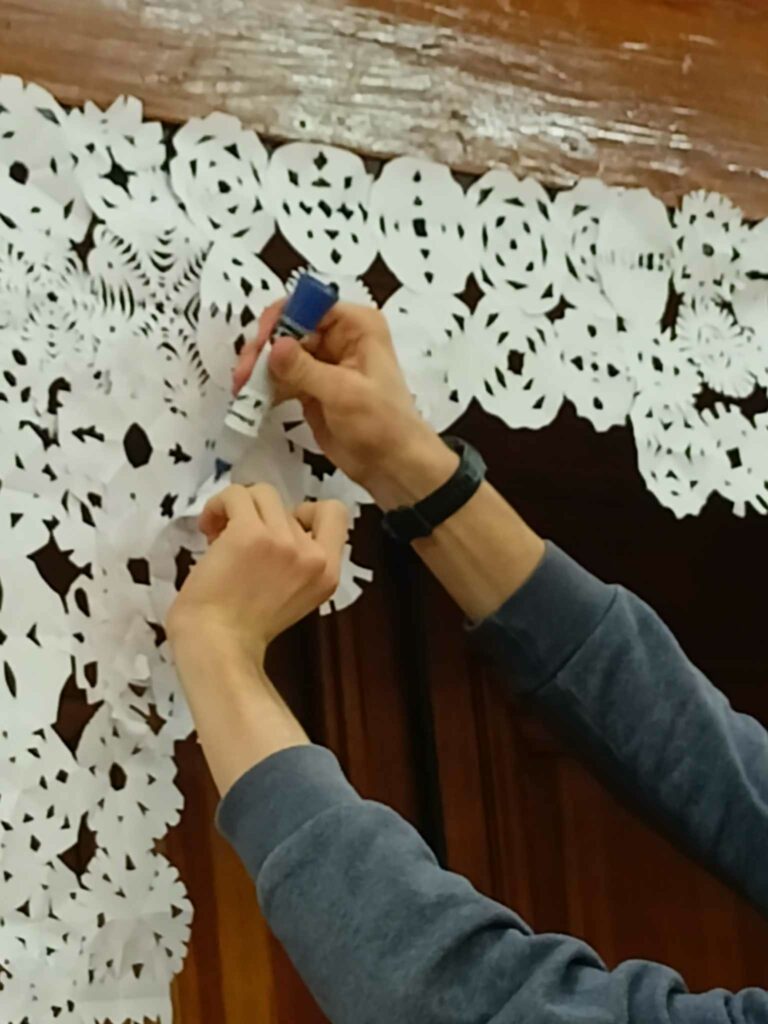 Od co najmniej połowy listopada uczennice i uczniowie klas pierwszych na lekcjach plastyki pracowicie wycinali dziesiątki papierowych śnieżynek. Pytanie; po co? Otóż, postanowiliśmy z tej mozolnej pracy uczynić kolejną, szkolną instalację artystyczną, tym razem w drzwiach naszej poczciwej auli. Gdy już wszystkie gwiazdeczki zostały powycinane, czterech zaradnych Elfów z klasy pierwszej B zbudowało ozdobne otoczenie aulowych wrót, przez które możemy teraz , jeszcze przed Świętami wkraczać do największej sali w szkole. Czy się podoba? Musicie orzec sami! Tymczasem Wesołych i oby również artystycznych Świąt! do kolejnych twórczych działań, już w Nowym 2024 Roku!