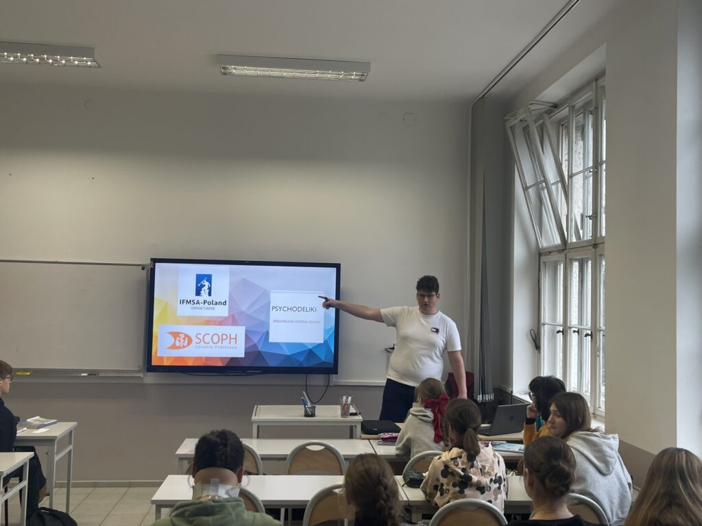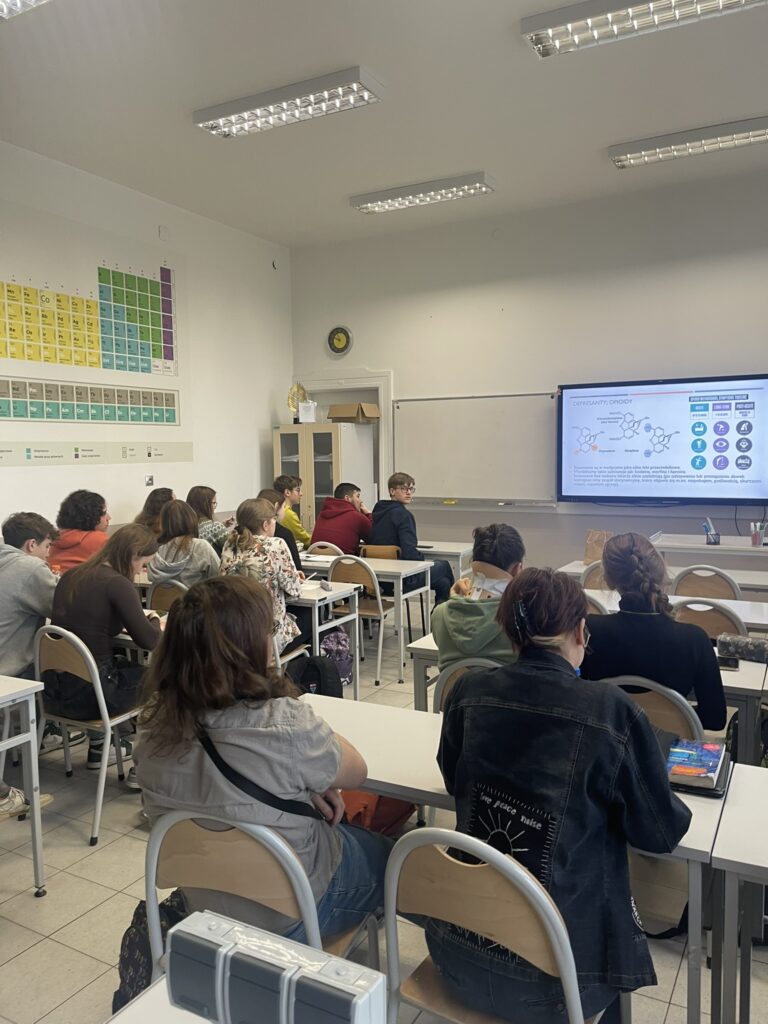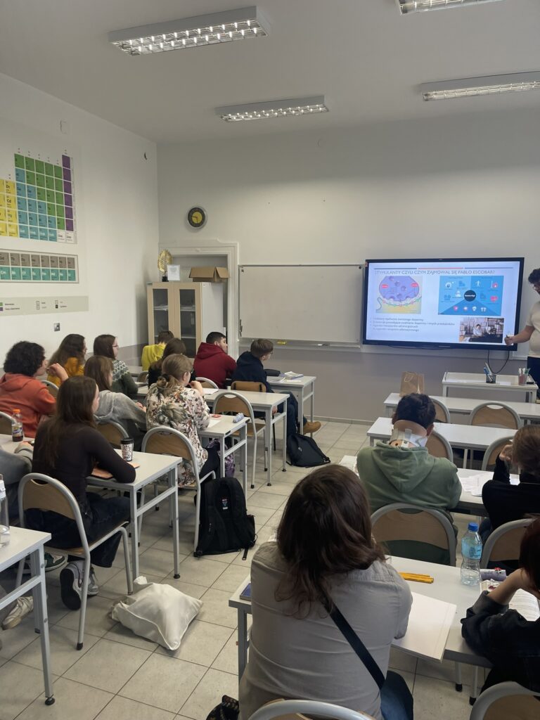 Mateusz w niezwykle profesjonalny sposób przedstawił młodzieży klasy 2A o profilu biologiczno – chemicznym zagrożenia związane z nadużywaniem substancji odurzających oraz wskazał zagrożenia i szanse jakie dają tytułowe psychodeliki. Omówił charakterystykę poszczególnych grup narkotyków, skupiając uwagę na wpływie rekreacyjnego użycia tych substancji na organizm. Poruszył także temat medycznego wykorzystania psychodelików zaznaczając, że mają one działanie terapeutyczne tylko pod nadzorem lekarza.