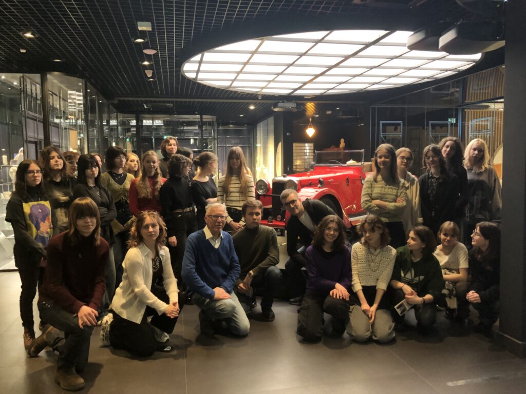 Nasza wyprawa założyła sobie odwiedzenie czynnej od niespełna trzech lat niesamowitej ekspozycji sztuki z epoki art deco, czyli lat 20-tych i 30-tych XX wieku. W historycznej kamienicy , dzięki znakomitej pani przewodnik mogliśmy doświadczyć czym była w sztuce epoka międzywojnia. Na wystawie wita nas symbol epoki – sportowy samochód Jowett Special Roadster z 1926 roku, angielski znak odważnych przemian, kino Odeon z fragmentem filmu z Eugeniuszem Bodo, oraz wnętrza mieszczańskich salonów. Mamy okazję zobaczyć eleganckie , modernistyczne meble, wynalazek epoki- tapczan (!), opalizujące szkło artystyczne, suknie i garnitury, również do wirtualnego “przymierzania”. Cudowna i przemyślana co do szczegółu aranżacja wystawy pozwala nam na chwilę przenieść się w świat gdzie Secesja spotkała się z technologią i modernizmem. Właśnie z niej wyrosła sztuka dekoracyjna zwana z języka francuskiego “art deco”. Warto wiedzieć, że niedaleko od tegoż muzeum, w Muzeum Mazowieckim eksponowane są fantastyczne zbiory sztuki właśnie secesyjnej, które warto zobaczyć w przyszłości. Co do zaś wieków dawniejszych, odwiedziliśmy po posiłku słynną katedrę płocką położoną na imponującej nadwiślańskiej skarpie. Katedra pamiętająca jeszcze rok 1079 , wielokrotnie przebudowana i restaurowana posiada w swoim wnętrzu replikę tzw Drzwi Płockich, czyli dawnych wrót do świątyni wykonanych w magdeburskiej odlewni z brązu i niestety- w XIII wieku zapewne zagrabionych z Płocka w wyniku walk i wypraw zbrojnych. Obecnie autentyczne Drzwi znajdują się na terenie Rosji, w cerkwi w Nowogrodzie. Doskonała replika wykonana w 1981 roku jest tłem zdjęcia naszej uczniowskiej grupy. Okładziny z brązu ukazują sceny z życia Chrystusa, oraz motywy rycerskie i dworskie. Sama katedra stanowi doskonały przykład połączenia sztuki romańskiej i gotyckiej, a także przebudów w stylu włoskiego renesansu. Jest jedną z pięciu najstarszych katedr w Polsce. Jeszcze tylko rzut oka na szeroko rozlaną w dolinie Królową Polskich Rzek i wracamy do autokaru. Pod szkołą jesteśmy z powrotem około godziny 20.00. Dziękujemy serdecznie pani prof. Henryce Mucek za pomoc w opiece podczas wyjazdu.  Pełni wrażeń, snujemy plany na nową już wyprawę.