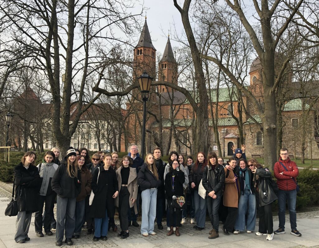 Nasza wyprawa założyła sobie odwiedzenie czynnej od niespełna trzech lat niesamowitej ekspozycji sztuki z epoki art deco, czyli lat 20-tych i 30-tych XX wieku. W historycznej kamienicy , dzięki znakomitej pani przewodnik mogliśmy doświadczyć czym była w sztuce epoka międzywojnia. Na wystawie wita nas symbol epoki – sportowy samochód Jowett Special Roadster z 1926 roku, angielski znak odważnych przemian, kino Odeon z fragmentem filmu z Eugeniuszem Bodo, oraz wnętrza mieszczańskich salonów. Mamy okazję zobaczyć eleganckie , modernistyczne meble, wynalazek epoki- tapczan (!), opalizujące szkło artystyczne, suknie i garnitury, również do wirtualnego “przymierzania”. Cudowna i przemyślana co do szczegółu aranżacja wystawy pozwala nam na chwilę przenieść się w świat gdzie Secesja spotkała się z technologią i modernizmem. Właśnie z niej wyrosła sztuka dekoracyjna zwana z języka francuskiego “art deco”. Warto wiedzieć, że niedaleko od tegoż muzeum, w Muzeum Mazowieckim eksponowane są fantastyczne zbiory sztuki właśnie secesyjnej, które warto zobaczyć w przyszłości. Co do zaś wieków dawniejszych, odwiedziliśmy po posiłku słynną katedrę płocką położoną na imponującej nadwiślańskiej skarpie. Katedra pamiętająca jeszcze rok 1079 , wielokrotnie przebudowana i restaurowana posiada w swoim wnętrzu replikę tzw Drzwi Płockich, czyli dawnych wrót do świątyni wykonanych w magdeburskiej odlewni z brązu i niestety- w XIII wieku zapewne zagrabionych z Płocka w wyniku walk i wypraw zbrojnych. Obecnie autentyczne Drzwi znajdują się na terenie Rosji, w cerkwi w Nowogrodzie. Doskonała replika wykonana w 1981 roku jest tłem zdjęcia naszej uczniowskiej grupy. Okładziny z brązu ukazują sceny z życia Chrystusa, oraz motywy rycerskie i dworskie. Sama katedra stanowi doskonały przykład połączenia sztuki romańskiej i gotyckiej, a także przebudów w stylu włoskiego renesansu. Jest jedną z pięciu najstarszych katedr w Polsce. Jeszcze tylko rzut oka na szeroko rozlaną w dolinie Królową Polskich Rzek i wracamy do autokaru. Pod szkołą jesteśmy z powrotem około godziny 20.00. Dziękujemy serdecznie pani prof. Henryce Mucek za pomoc w opiece podczas wyjazdu.  Pełni wrażeń, snujemy plany na nową już wyprawę.