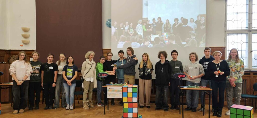 W czwartek 14.11.2024 aula V LO gościła miłośników układania kostki Rubika 3x3x3. Zorganizowania Kostkowego Wyzwania podjęła się już po raz trzeci Natalia Bujny 4b wraz z pomocnikami: Alicją Lisowską 2b, Zofią Wysocką 2c, Mateuszem Kamińskim 2c oraz Stanisławem Bielawskim3b. To była wyjątkowa edycja, ponieważ do udziału w zawodach zgłosiła się rekordowa liczba uczestników: 25 uczennic i uczniów V LO oraz zaproszeni goście – 5 uczniów z I LO w Gdańsku. Organizatorzy przygotowali wiele atrakcji: konkurs główny, konkurs dla publiczności Cube Tower Challenge, a na zakończenie pojedynek drużynowy V LO – I LO.