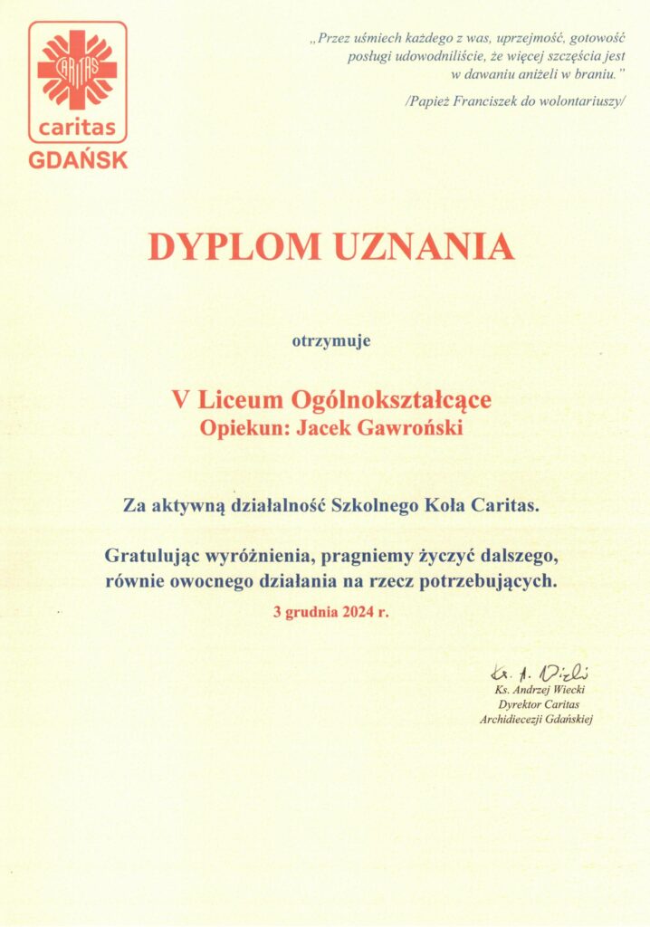 W wigilię Dnia św. Mikołaja, 5 grudnia jest obchodzony corocznie Światowy Dzień Wolontariusza. Z tej okazji dwa dni wcześniej miała miejsce gala CARITAS, na której dyplom uznania otrzymało SKC z VLO jako jedyna szkoła ponadpodstawowa w archidiecezji gdańskiej. A co robimy na co dzień? W ten weekend zbieramy żywność w ramach ogólnopolskiej akcji “Tak. Pomagam!”, w następny będziemy pakować szlachetną paczkę dla rodziny w Oliwie, a tuż przed świętami zawieziemy dary do Domowego Hospicjum dla Dzieci w ramach ogólnoszkolnej zbiórki “Paczuszka dla Maluszka”. Jeśli chciał/a/byś nas wspomóc – serdecznie zapraszamy, dołącz do nas 🙂