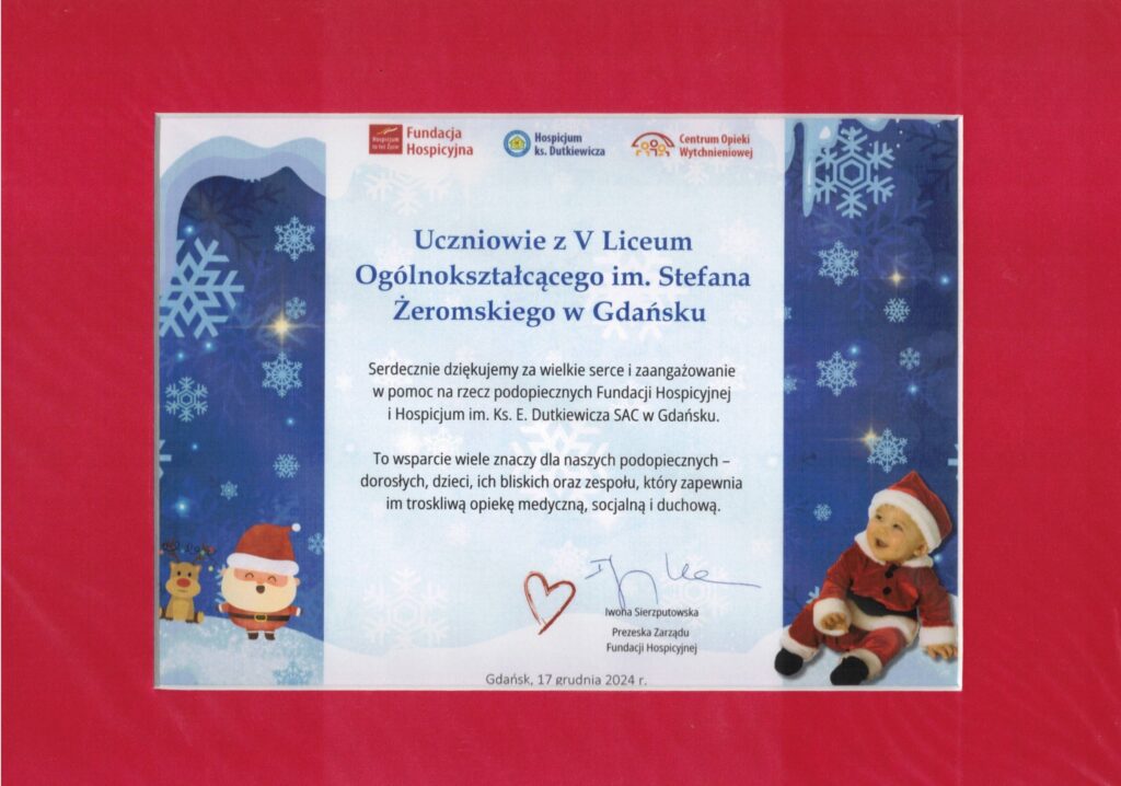 4 kartony darów trafiły w piątek 20 grudnia 2024 r. do siedziby Hospicjum Domowego dla Dzieci w Gdańsku. Były wśród nich m. in.: pieluchy, podkłady higieniczne, chusteczki nawilżane, kosmetyki dla alergików i do pielęgnacji, pościel, a nawet materac przeciwodleżynowy! Bardzo dziękujemy całej społeczności VLO, która już po raz czwarty zaangażowała się w akcję Paczuszka dla Maluszka: Nauczycielom, Uczniom i Ich Rodzicom – https://photos.app.goo.gl/LBpfenvMPuAeSRQt8 🙂