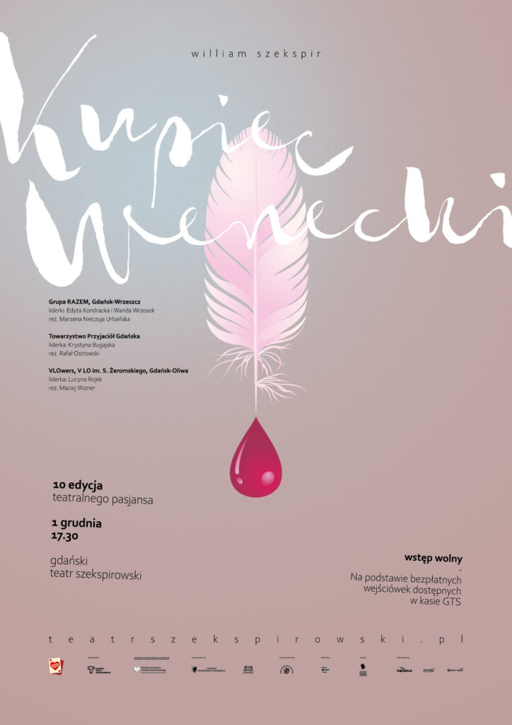 Premiera odbędzie się w Gdańskim Teatrze Szekspirowskim 1 grudnia o godz. 17:30 w ramach przeglądu trzech spektakli inspirowanych „Kupcem weneckim” – obowiązują bezpłatne wejściówki, do odbioru w kasie GTS.