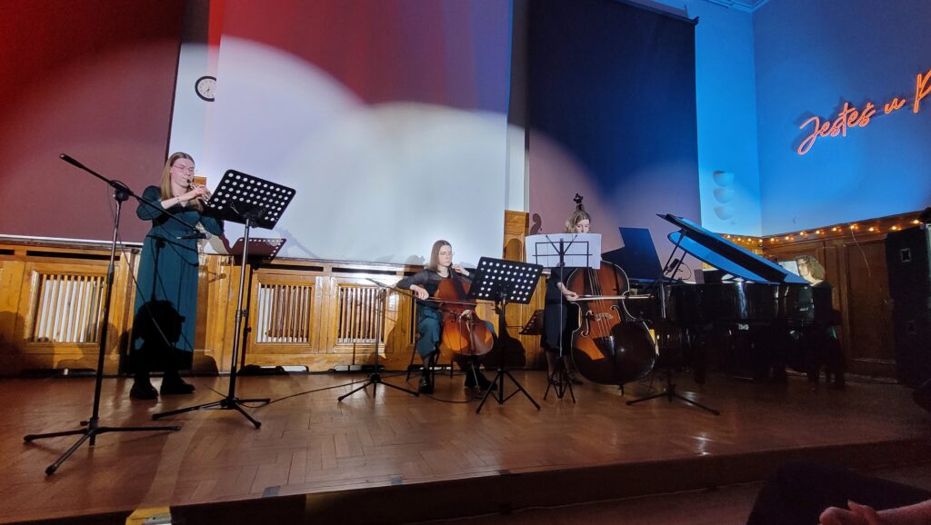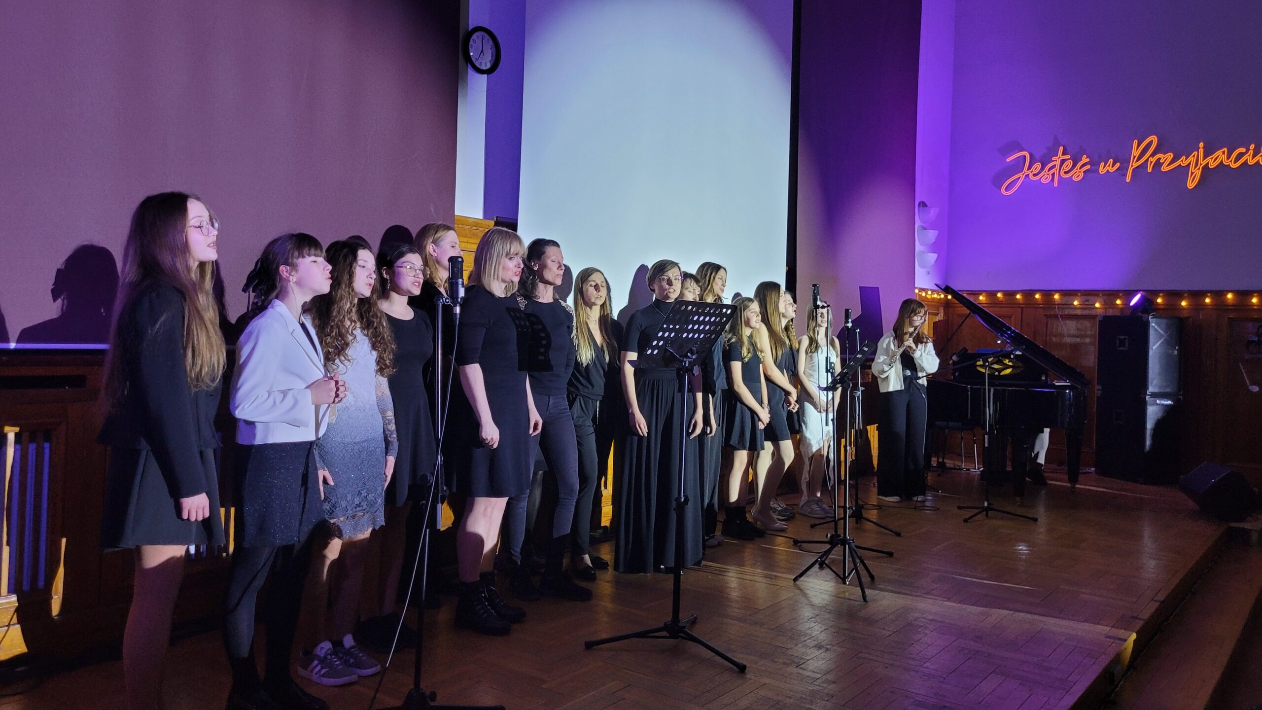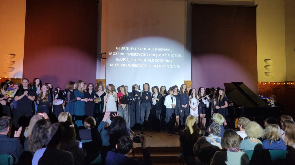 Nasze zaproszenie przyjął oczywiście Maciej Grycendler, który podobnie jak rok temu przyjechał z uczennicami z ze szkoły podstawowej nr 89 w Gdańsku, oraz z zespołem “Czarno na Białym”, który wskrzesił po 20 latach przerwy w roku ubiegłym na jubileuszowy Koncert. Jak widać zespół dostał nowych skrzydeł i od roku regularnie się spotyka. Ich występ był zwieńczeniem wieczoru i muzycznej uczty.