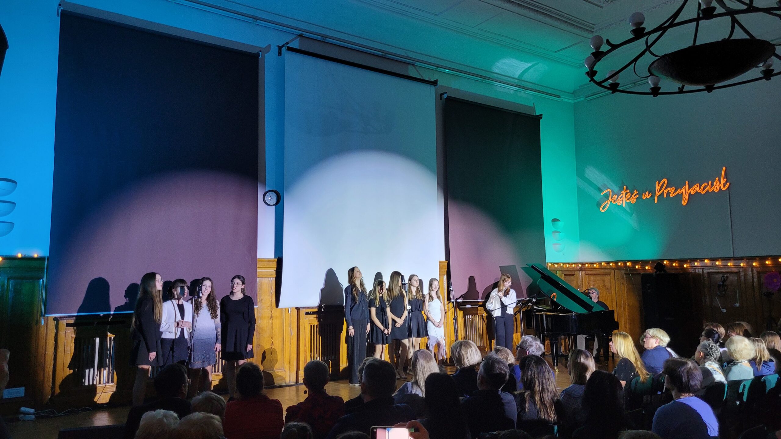 Widzowie mogli nie tylko posłuchać naszych artystów, ale i podziwiać ich w pięknej, barwnej oprawie. I tak na przykład aktorzy musicalu “Fine”, przemieszczający się na scenie podczas występu, mieli precyzyjnie dobrany kolor światła na każdy fragment swojego przedstawienia i dodatkowo światło podążało za nimi na scenie. To oczywiście przede wszystkim zasługa Wiktora, który dla każdego artysty skonfigurował oświetlenie wedle potrzeb i ich życzeń.