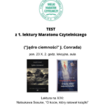 Na test z pierwszej lektury Maratonu Czytelniczego Na Literackim Szlaku zapraszamy w poniedziałek 23 października, na 2. godzinie lekcyjnej do auli szkoły. Dorota Bandzmer, Tomasz Zieliński